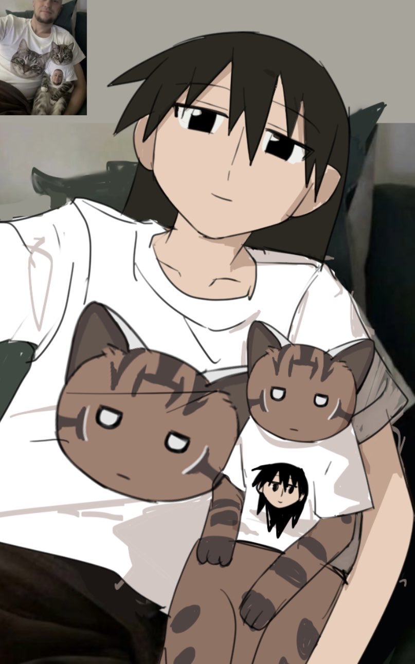 1girl alsdhpvp4 animal azumanga_daiou black_eyes black_hair blank_eyes cat closed_mouth commentary hair_between_eyes highres indoors iriomote_cat long_hair looking_at_viewer mayaa_(azumanga_daioh) meme print_shirt sakaki_(azumanga_daioh) selfie shirt short_sleeves smile t-shirt upper_body white_shirt