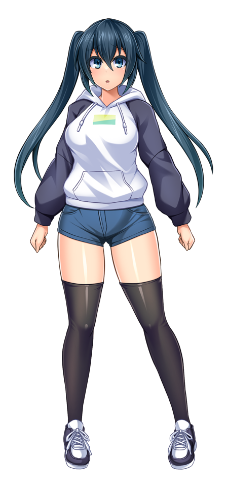 1girl :o black_hair black_thighhighs blue_eyes blue_hair blue_shorts blush breasts casual denim denim_shorts full_body game_cg hair_between_eyes hood hood_down hoodie ikameshi_(nega96396) iris_(seisenki_iris) large_variant_set long_hair long_sleeves looking_at_viewer lusterise non-web_source official_art open_mouth parted_lips raised_eyebrows seisenki_iris self-datamine shoes short_shorts shorts simple_background sneakers solo standing tachi-e thighhighs transparent_background twintails variant_set white_background white_hoodie