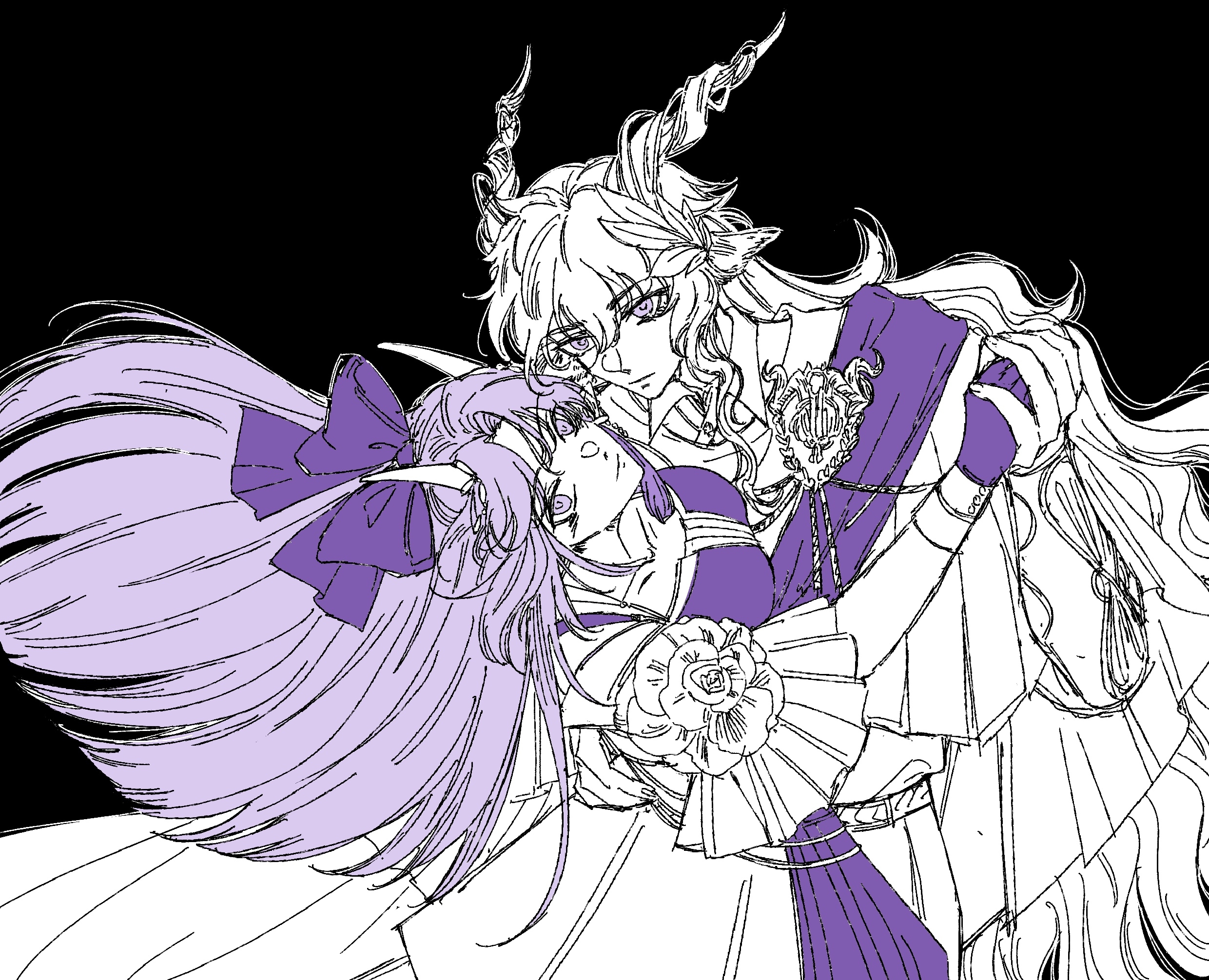 1boy 1girl animal_ears arknights black_background bow capelet commentary cowboy_shot dancing dress ebenholz_(ambience_synesthesia)_(arknights) ebenholz_(arknights) gloves hair_bow head_back hibiscus_(arknights) hibiscus_the_purifier_(arknights) hibiscus_the_purifier_(romance_overflow)_(arknights) highres holding_hands horns laurel_crown leaning_back long_hair looking_at_viewer lucy442684 monochrome purple_bow purple_eyes purple_gloves purple_hair purple_sash sash sheep_ears single_sidelock spot_color untranslatable_commentary wavy_hair