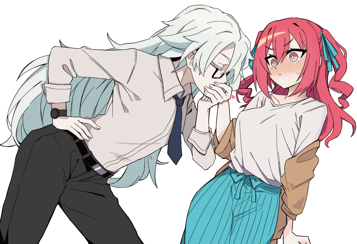 2girls :< aqua_ribbon aqua_skirt arm_at_side belt belt_buckle black-framed_eyewear black_belt black_pants blue_necktie blue_ribbon blush breasts bright_pupils brown_jacket buckle chopingme closed_mouth collarbone collared_shirt commentary cowboy_shot glasses grey_shirt hair_between_eyes hand_on_own_hip hand_up heart holding_hands jacket kiss kissing_hand leaning_forward long_hair long_sleeves looking_at_another medium_breasts multiple_girls necktie nose_blush off_shoulder ogami_shiro open_clothes open_jacket pants pink_eyes pleated_skirt profile red_hair ribbon semi-rimless_eyewear shirt shirt_tucked_in shoujo_kageki_revue_starlight shoujo_kageki_revue_starlight_-re_live- simple_background skirt sleeves_rolled_up standing sweatdrop takachiho_stella transparent_background under-rim_eyewear v-shaped_eyebrows very_long_hair watch white_hair white_pupils white_shirt wide-eyed wristwatch yuri