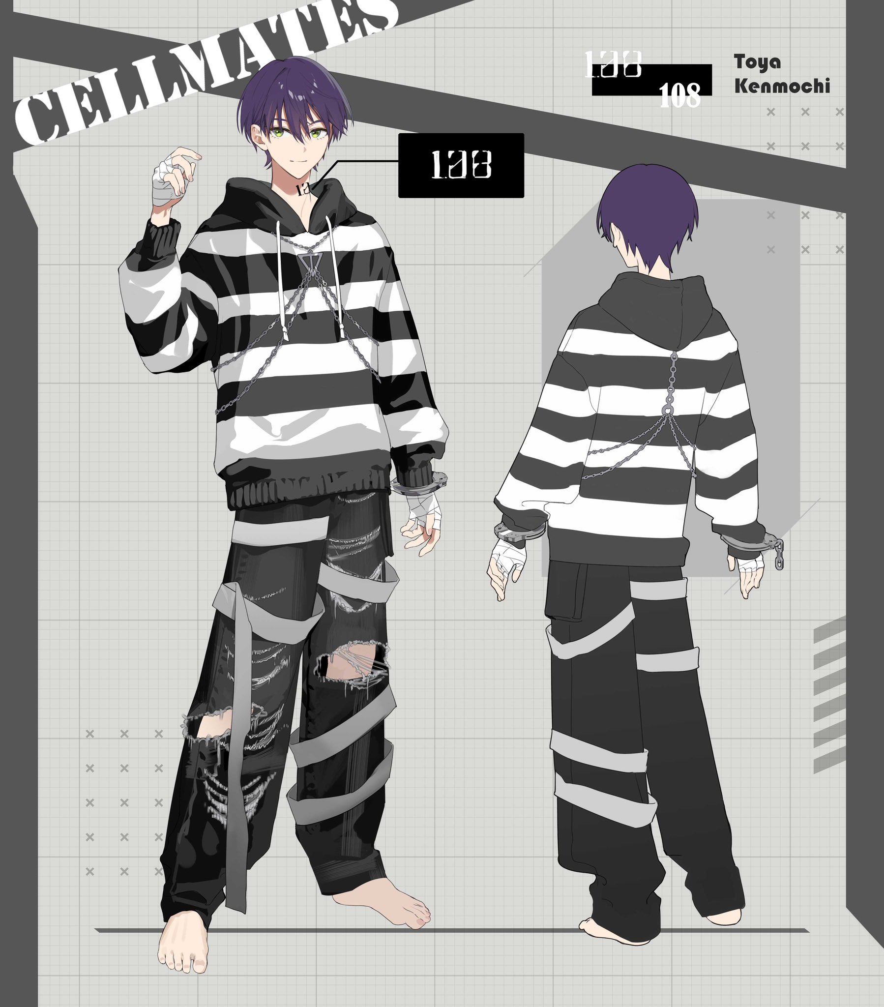 1boy baggy_pants bandaged_hand bandaged_leg bandages barefoot black_hoodie black_pants character_name closed_mouth commentary_request cuffs denim double-parted_bangs full_body green_eyes group_name hair_between_eyes handcuffs highres hood hood_down hoodie jeans jewelry kenmochi_touya looking_at_viewer loose_bandages lowro_(en) male_focus multiple_views neck_tattoo necklace nijisanji number_tattoo official_alternate_costume official_art pants prison_clothes purple_hair reference_sheet second-party_source short_hair smile solo standing striped_clothes striped_hoodie tattoo torn_clothes torn_pants two-tone_hoodie virtual_youtuber white_hoodie