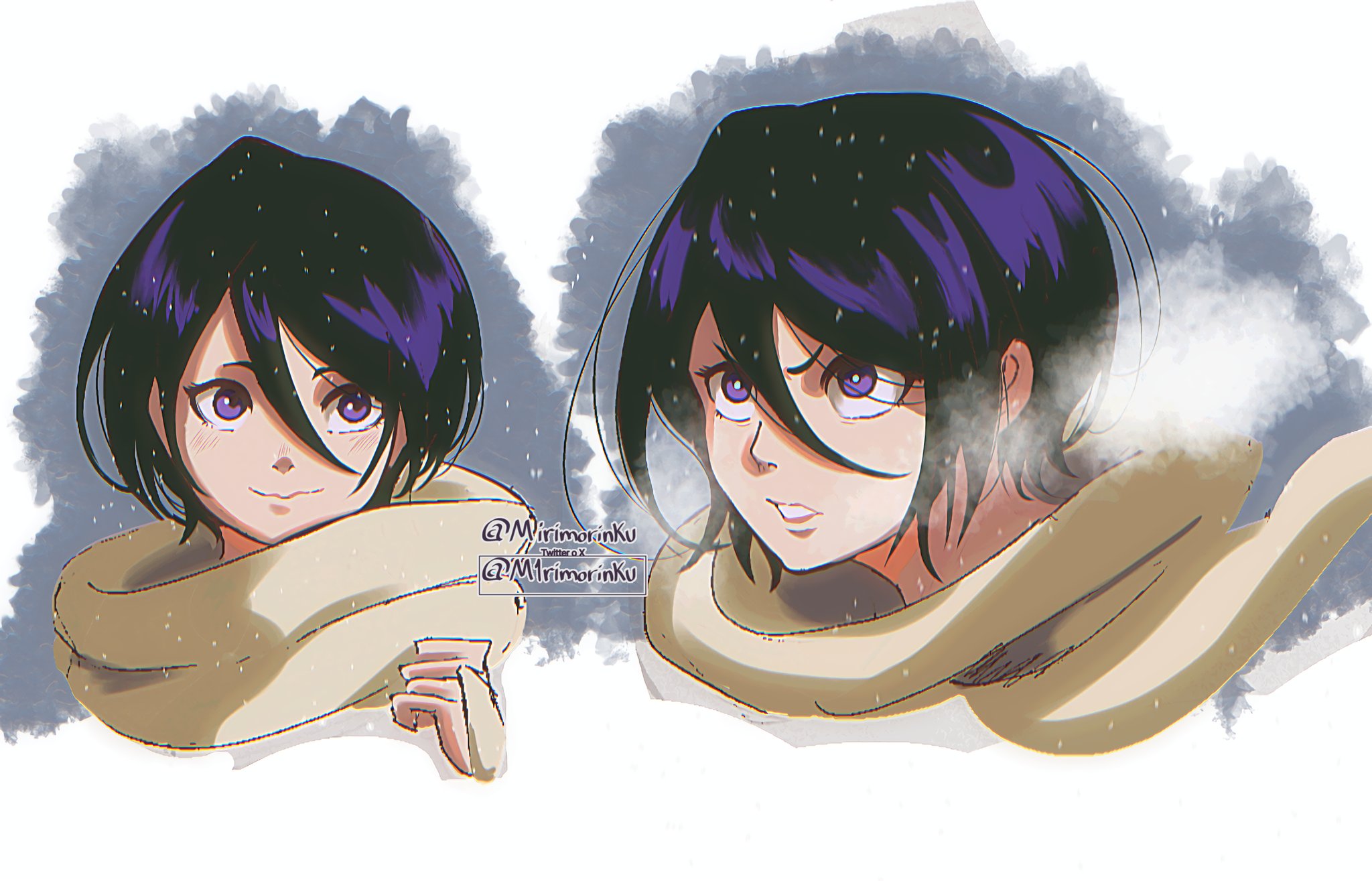 1girl bleach breath chromatic_aberration colored_sclera commentary highres kuchiki_rukia m1rimorinku purple_eyes purple_hair serious short_eyebrows smile snowing twitter_username v-shaped_eyebrows watermark yellow_sclera