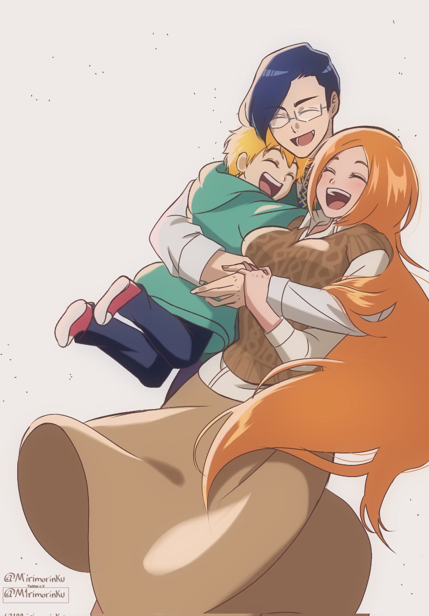 1girl 2boys black_hair bleach bleach:_epilogue brown_skirt brown_sweater child closed_eyes commentary_request corrupted_twitter_file glasses green_hoodie group_hug highres hood hoodie hug inoue_orihime ishida_uryuu kurosaki_kazui m1rimorinku mother_and_child mother_and_son multiple_boys open_mouth orange_hair parent_and_child skirt smile spanish_commentary sweater twitter_username watermark