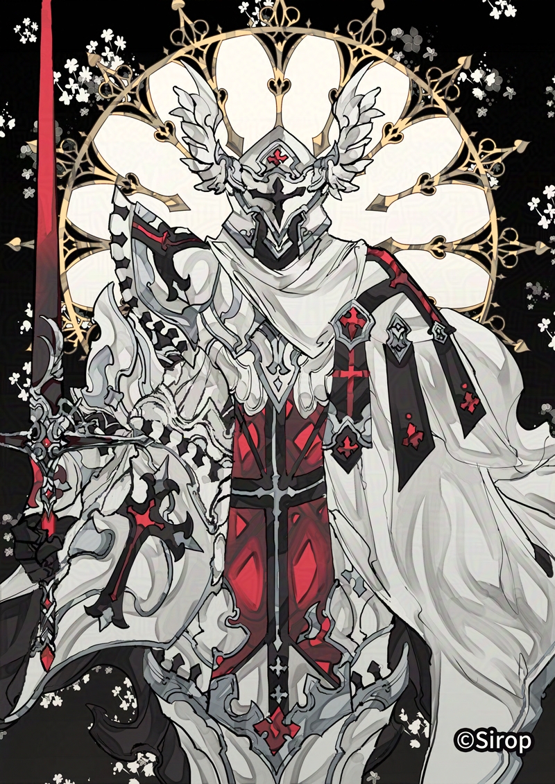 1other armor artist_name black_background commentary cross flower helmet holding holding_sword holding_weapon looking_at_viewer original sirop solo sword weapon white_armor winged_helmet