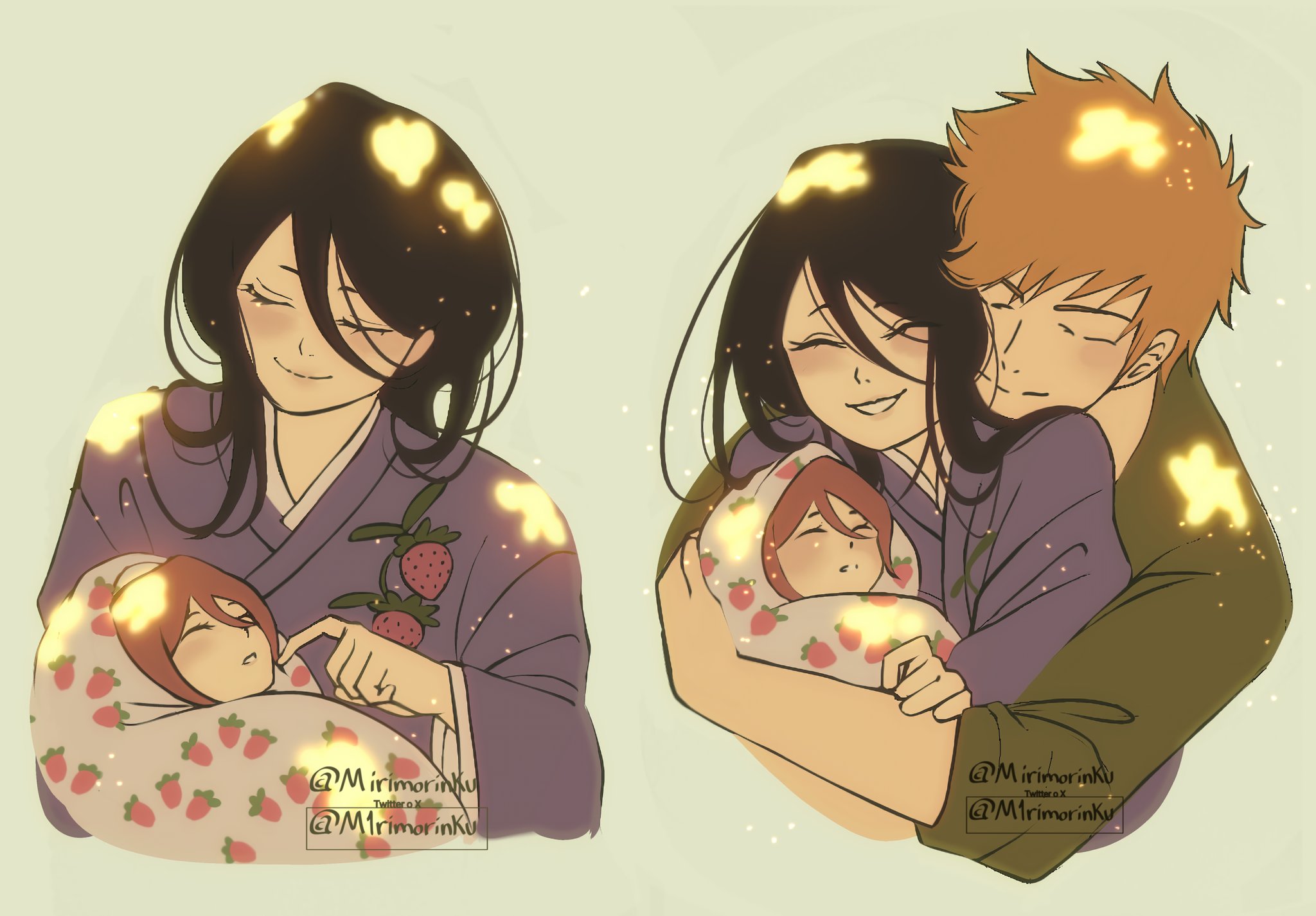 1boy 2girls abarai_ichika aged_down baby black_hair blanket bleach bleach:_epilogue carrying carrying_baby carrying_person commentary highres hug hug_from_behind if_they_mated japanese_clothes kimono kuchiki_rukia kurosaki_ichigo long_hair m1rimorinku mother_and_child mother_and_daughter multiple_girls orange_hair parent_and_child purple_kimono watermark