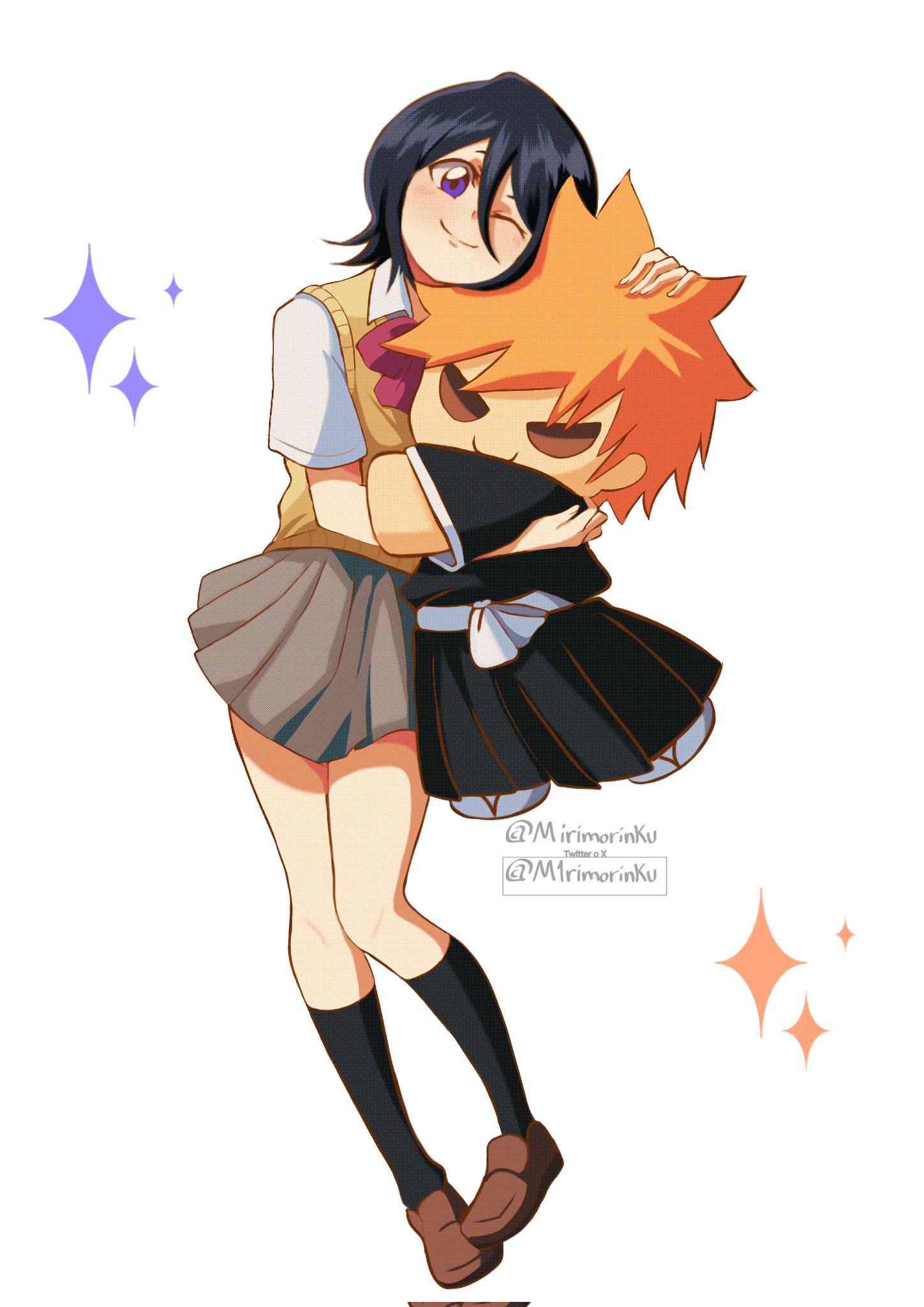 1girl black_hair black_socks bleach bow bowtie brown_shoes character_doll commentary corrupted_twitter_file doll full_body hair_between_eyes highres holding holding_doll karakura_high_school_uniform kneehighs kuchiki_rukia kurosaki_ichigo m1rimorinku miniskirt one_eye_closed orange_sweater_vest pleated_skirt purple_eyes red_bow red_bowtie school_uniform shoes signature skirt smile socks solo sparkle sweater_vest twitter_username untranslatable_commentary