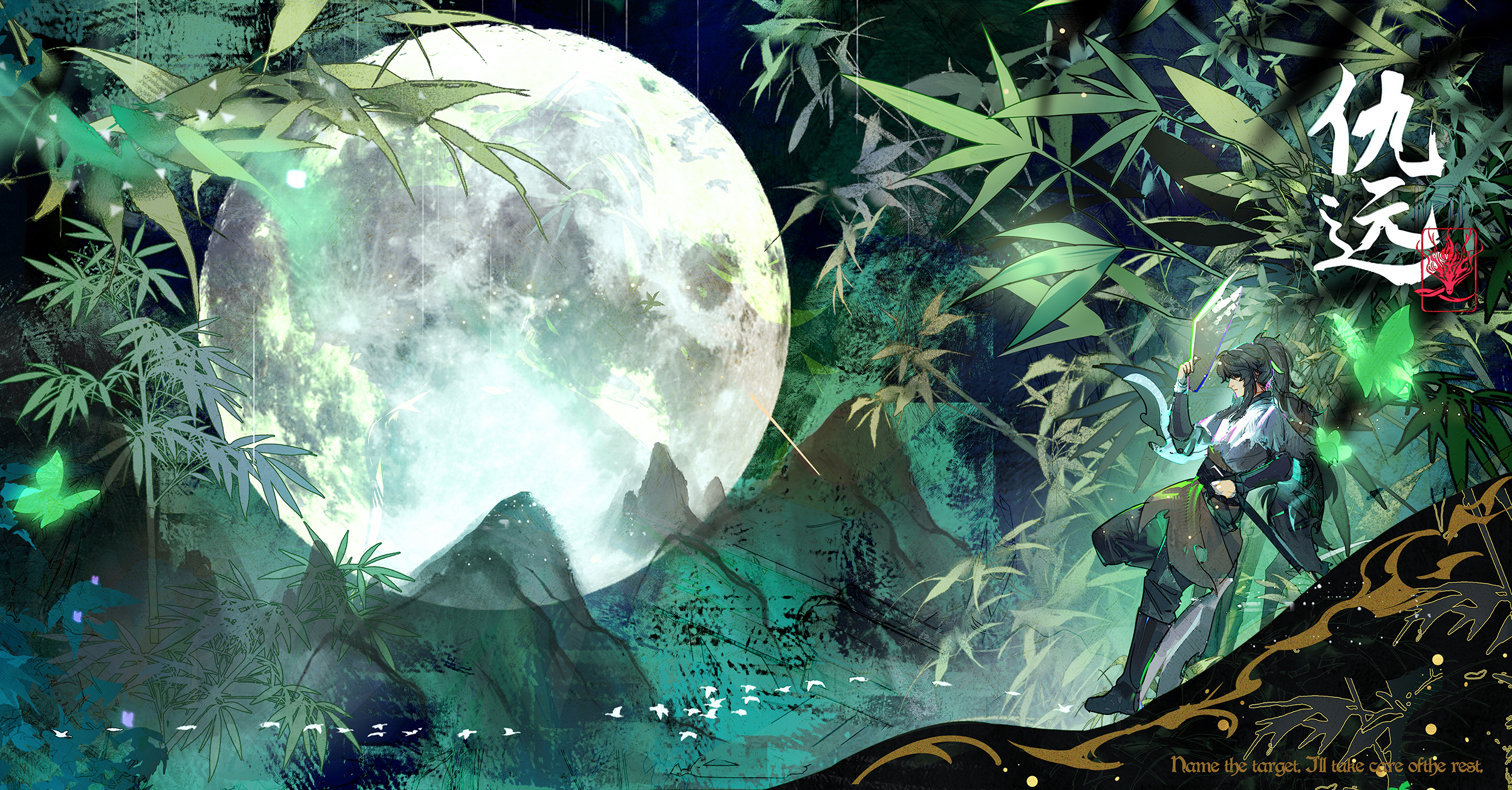1boy bamboo bamboo_forest black_hair chinese_clothes chinese_commentary chinese_text commentary_request forest full_body full_moon grey_eyes hanfu high_ponytail highres holding holding_sword holding_weapon long_hair moehikaru moon nature ponytail qiuyuan_(wuthering_waves) solo sword weapon wuthering_waves