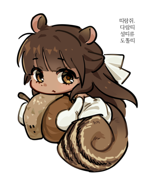1girl :< acorn animal_ears bare_shoulders blunt_bangs bow brown_eyes brown_hair chibi chibi_only closed_mouth commentary_request dark-skinned_female dark_skin dress ehddmftk elbow_gloves fate/strange_fake fate_(series) full_body gloves hair_bow holding holding_acorn kemonomimi_mode korean_commentary korean_text long_hair looking_at_viewer simple_background solo squirrel_ears squirrel_tail strapless strapless_dress tail tine_chelc translation_request very_long_hair white_background white_bow white_dress white_gloves