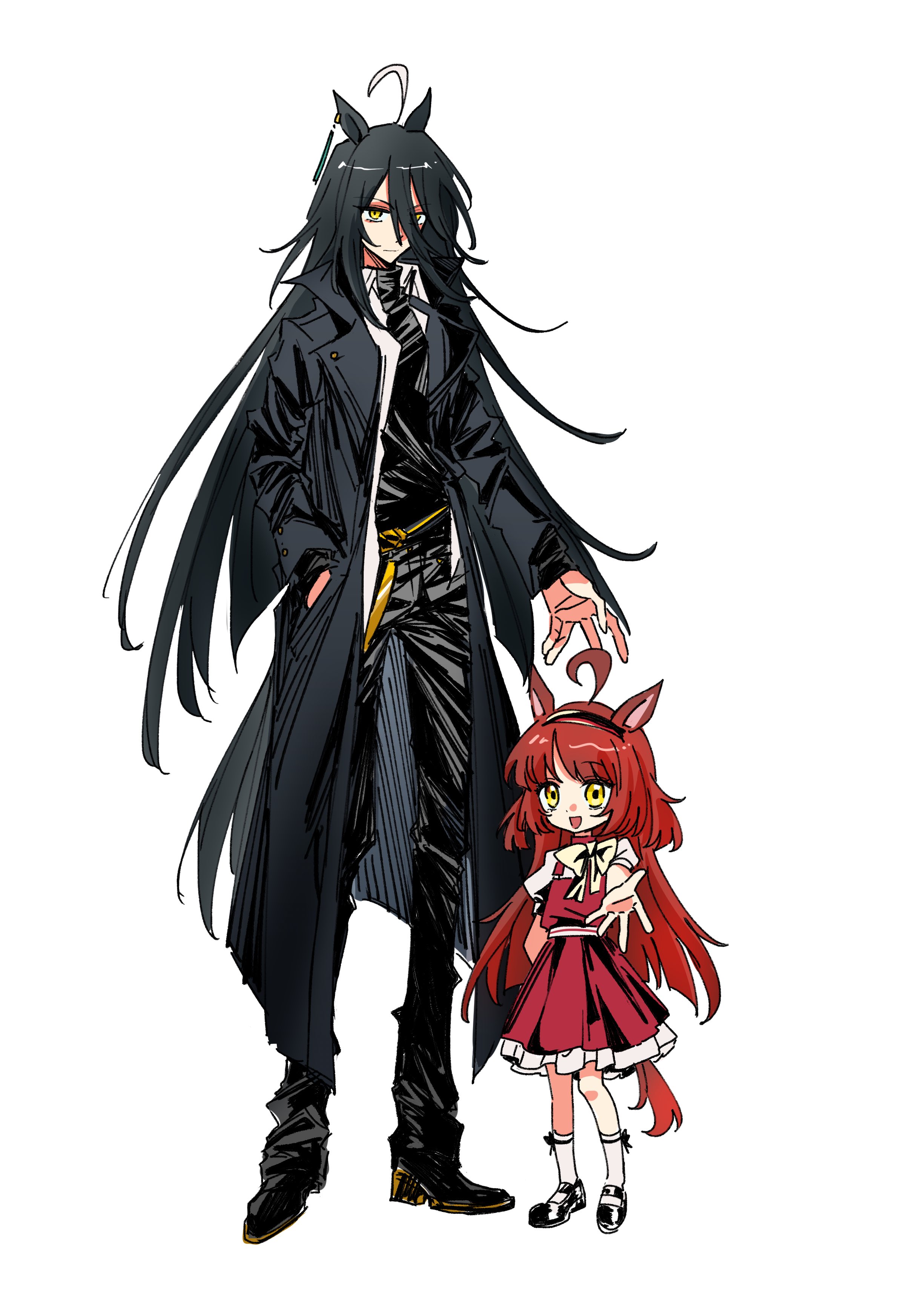 1boy 1girl absurdres aged_down ahoge animal_ears ark_koiz35 black_hair blunt_bangs blunt_ends closed_mouth commentary_request dress father_and_child father_and_daughter frills genderswap genderswap_(ftm) hair_between_eyes hairband highres horse_ears horse_girl horse_tail long_bangs long_hair long_hair_between_eyes long_sleeves looking_at_viewer manhattan_cafe_(umamusume) parent_and_child red_desire_(umamusume) red_dress red_hair red_hairband simple_background smile standing tail umamusume umamusume_horse_relations white_background yellow_eyes
