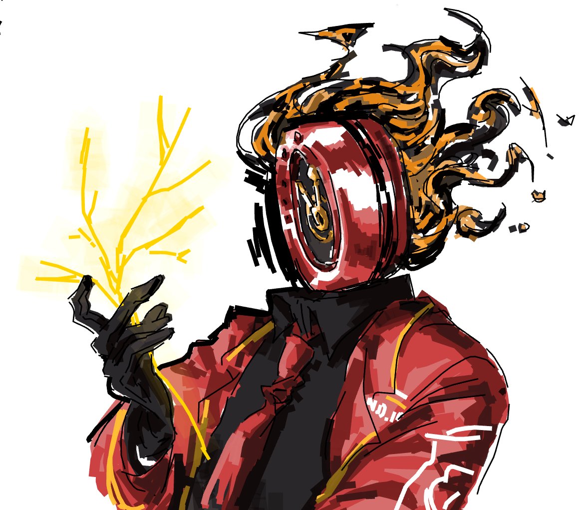 1other clock coat collared_shirt commentary dante_(limbus_company) fire golden_bough_(project_moon) hand_up lapels limbus_company necktie notched_lapels object_head project_moon red_coat red_necktie rinri_020 shirt simple_background solo untranslatable_commentary white_background yellow_trim