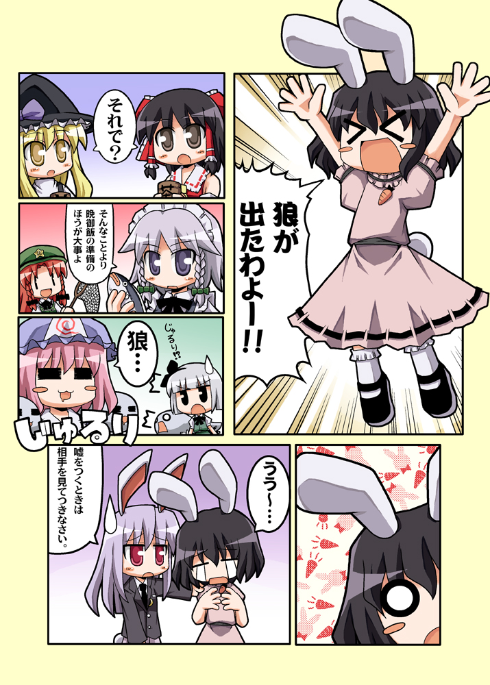 >_< 6+girls :3 :d :o =_= ^^^ animal animal_ears archived_source arms_up ascot black_hair black_hairband black_jacket black_necktie black_shoes blonde_hair blue_eyes bob_cut bow braid braided_sidelocks brown_eyes butterfly_net carrot_necklace crescent crying cup d: detached_sleeves dress drooling emphasis_lines fish frilled_dress frilled_hat frilled_socks frills ghost green_hair_ornament green_hat green_vest grey_hair hair_between_eyes hair_bow hair_tubes hairband hakurei_reimu hand_net hat hat_bow hat_ornament herada_mitsuru hitodama holding holding_animal holding_butterfly_net holding_cup holding_fish hong_meiling inaba_tewi izayoi_sakuya jacket jewelry jitome kirisame_marisa konpaku_youmu konpaku_youmu_(ghost) long_hair maid_headdress mary_janes medium_hair mob_cap mouth_drool multiple_girls multiple_hair_bows neck_ribbon necklace necktie o_o open_mouth pink_hair pleated_skirt puffy_short_sleeves puffy_sleeves purple_bow purple_hair purple_hat rabbit_ears rabbit_girl rabbit_tail red_eyes red_hair red_shirt reisen_udongein_inaba ribbon ribbon-trimmed_dress ribbon_trim saigyouji_yuyuko shirt shoes short_hair short_sleeves sidelocks skirt sleeveless sleeveless_shirt smile socks star_(symbol) star_hat_ornament streaming_tears sweatdrop tail tears touhou triangular_headpiece twin_braids vest white_socks witch_hat yellow_ascot yellow_eyes yunomi |_|