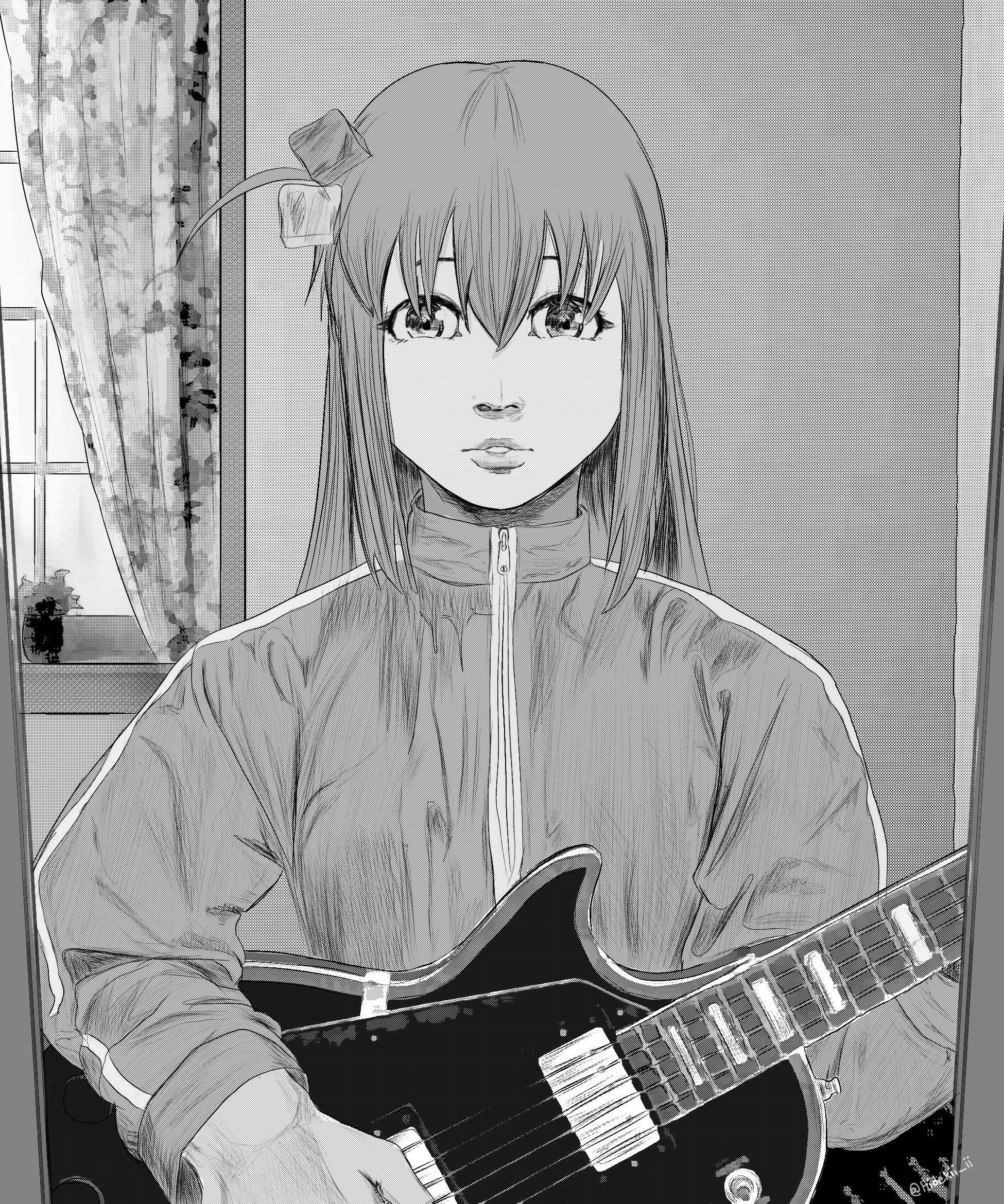 1girl bocchi_the_rock! cube_hair_ornament curtains electric_guitar gotoh_hitori greyscale guitar hair_between_eyes hair_ornament hidekii_ii highres holding holding_guitar holding_instrument indoors instrument jacket lips long_hair long_sleeves looking_at_viewer monochrome one_side_up solo track_jacket twitter_username upper_body window
