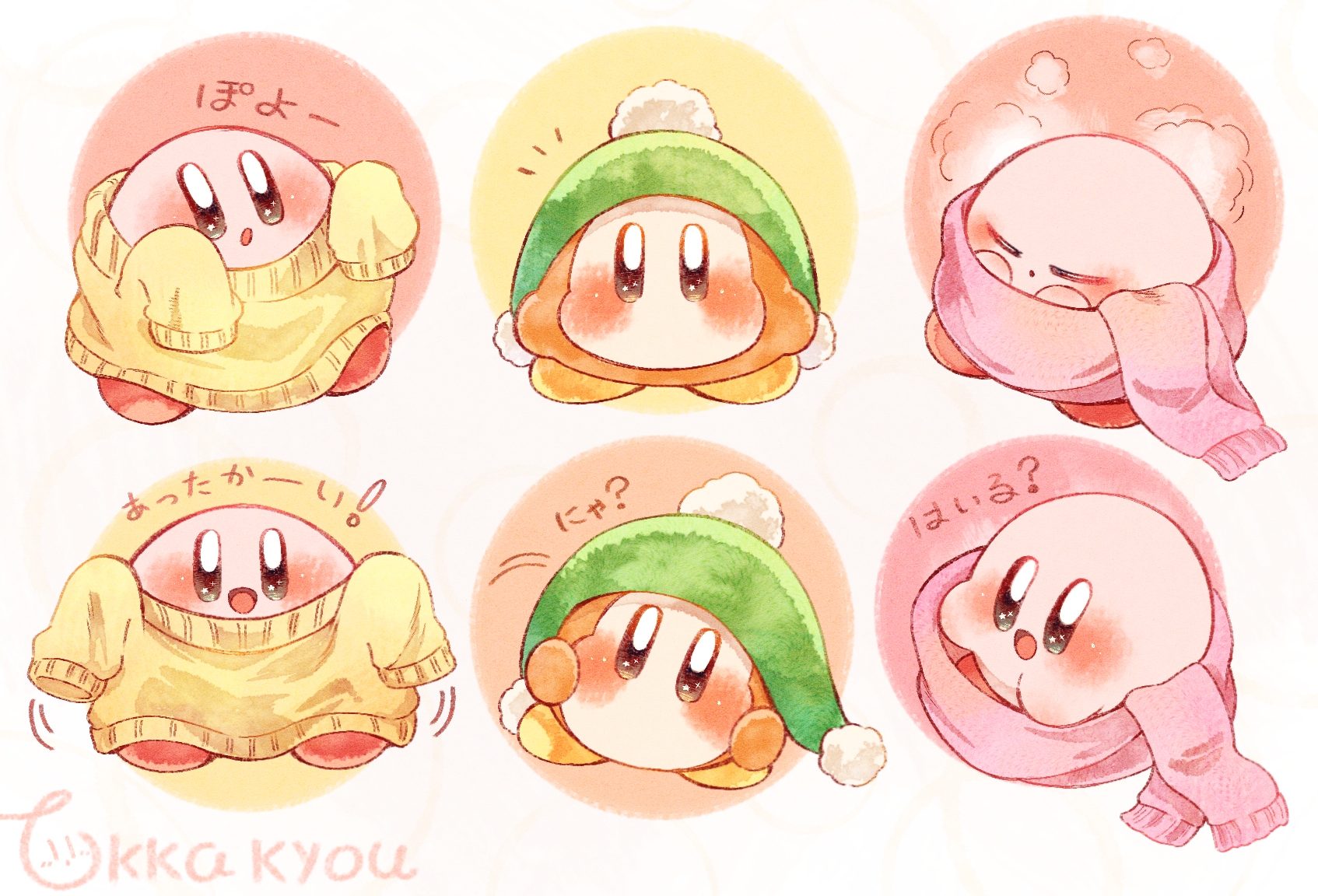 :d :o blush brown_eyes closed_eyes commentary_request green_hat hat highres kirby kirby_(series) long_sleeves nintendo no_humans open_mouth oversized_clothes pink_scarf pom_pom_(clothes) scarf signature sleeves_past_fingers sleeves_past_wrists smile sweater tokkakyou translation_request waddle_dee yellow_sweater