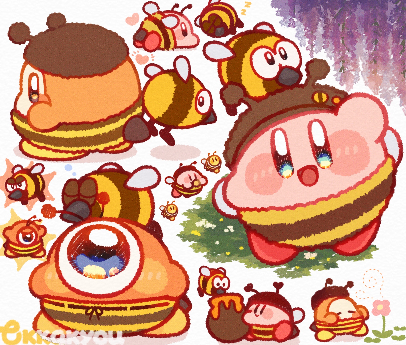 antennae arm_up artist_name bee bee_costume black_hat black_pants blue_eyes brown_eyes bug closed_eyes closed_mouth commentary crossover fake_antennae flower flying grass hat heart highres honeypot insect insect_wings kirby kirby_(series) looking_at_viewer looking_up lying mario_(series) multiple_views nintendo no_humans on_stomach one-eyed open_mouth pants pink_flower purple_flower sleeping smile standing stingby stinger striped_clothes striped_pants tokkakyou two-tone_pants untranslatable_commentary waddle_dee waddle_doo waving wings wisteria yellow_pants zzz
