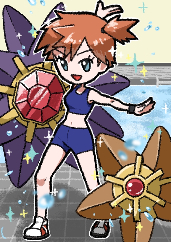 1girl :d asymmetrical_hair bikini blue_bikini blue_eyes breasts eyelashes full_body gem gen_1_pokemon happy jewelry knees looking_at_viewer midriff misty_(pokemon) navel nintendo open_mouth orange_hair outstretched_arms pokemon pokemon_firered_and_leafgreen ponytail pool shoes short_hair shorts side_ponytail smile sneakers sparkle spread_legs standing starmie staryu swimsuit tile_floor tiles water water_drop wristband