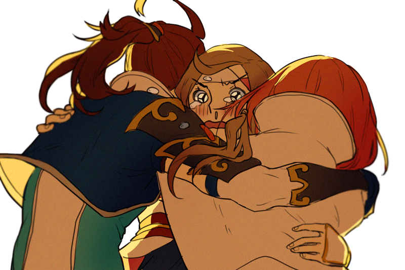 1boy 2girls :o apticho crying crying_with_eyes_open fire_emblem fire_emblem_fates group_hug hairband hana_(fire_emblem) happy happy_tears hug japanese_clothes multiple_girls nintendo open_mouth pink_hair red_hair sakura_(fire_emblem) subaki_(fire_emblem) tears