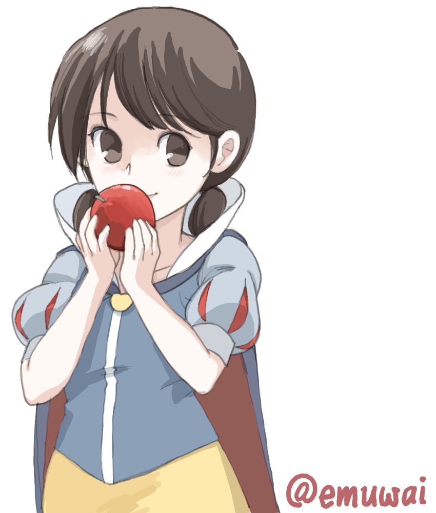 1girl apple breasts brown_hair commentary_request cosplay dress emuwai food fruit kantai_collection low_twintails medium_breasts multicolored_dress name_connection one-hour_drawing_challenge popped_collar shirayuki_(kancolle) simple_background smile snow_white_(disney) snow_white_(disney)_(cosplay) snow_white_and_the_seven_dwarfs_(disney) solo twintails twitter_username white_background