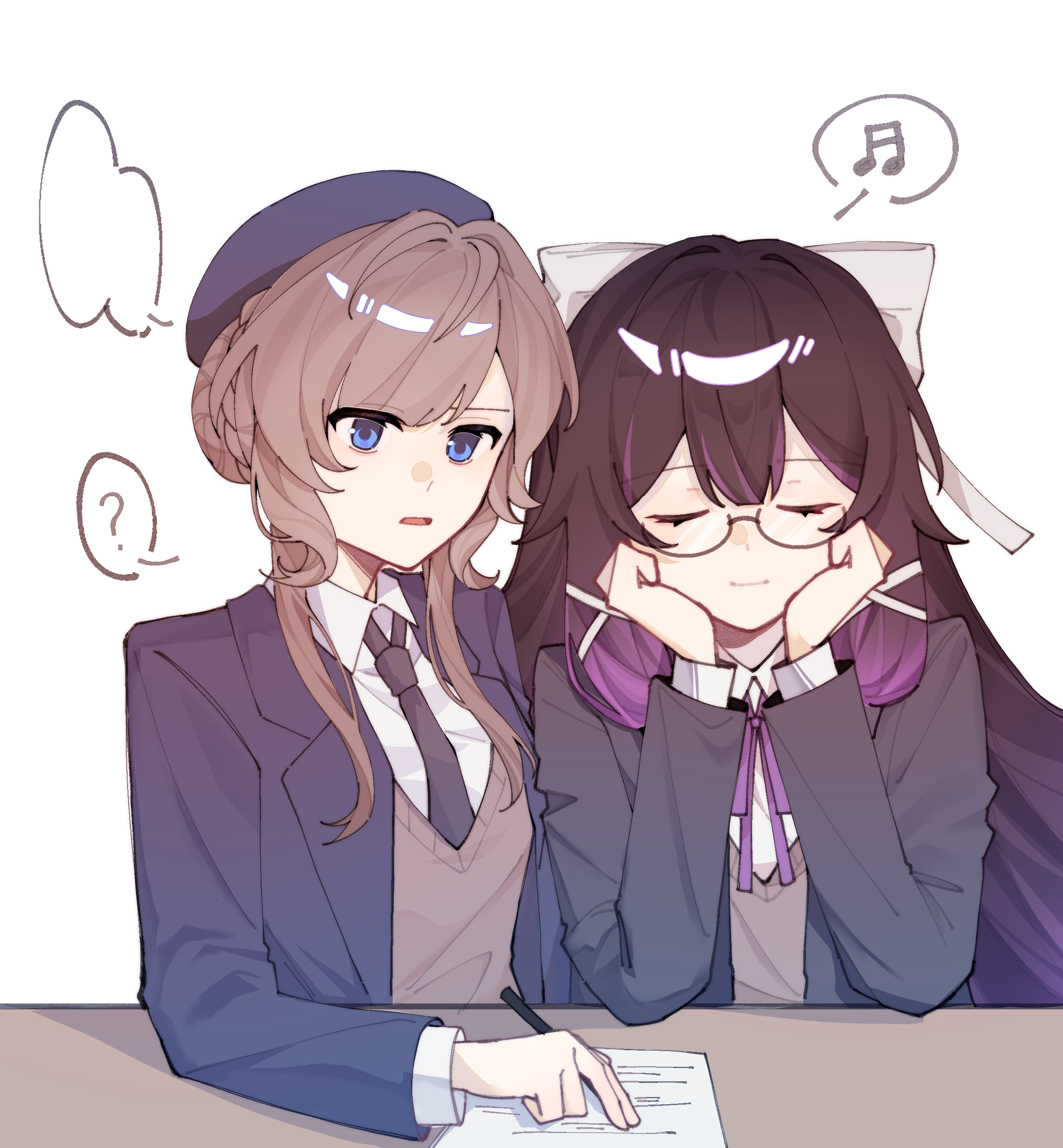 2girls ? absurdres alternate_costume black_hair black_jacket black_necktie blazer blue_eyes blue_hat blue_jacket bow braid brown_hair brown_sweater bun_with_braided_base chinese_commentary closed_eyes closed_mouth collared_shirt columbina_(genshin_impact) commentary_request contemporary elbow_rest genshin_impact glasses hair_bow hair_bun hair_ribbon hat head_rest highres holding holding_pen jacket jixushendushuimian light_smile long_hair long_sleeves multicolored_hair multiple_girls musical_note neck_ribbon necktie open_clothes open_jacket open_mouth paper pen purple_hair purple_ribbon ribbon sandrone_(genshin_impact) school_uniform semi-rimless_eyewear shirt streaked_hair sweater under-rim_eyewear v-neck white_background white_bow white_ribbon white_shirt
