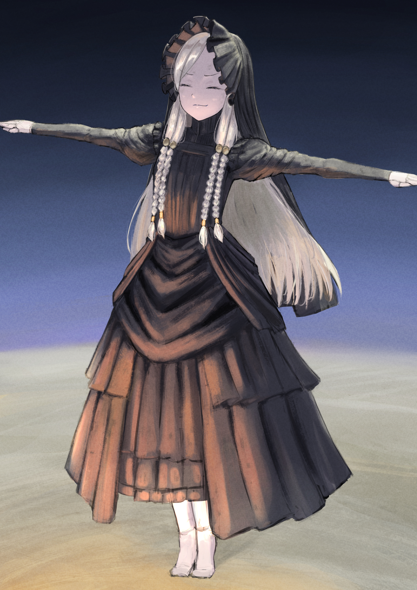 1girl black_dress blonde_hair closed_eyes commentary_request dress elden_ring elden_ring_nightreign full_body highres long_hair revenant_(elden_ring) solo t-pose tiptoes triangle_del