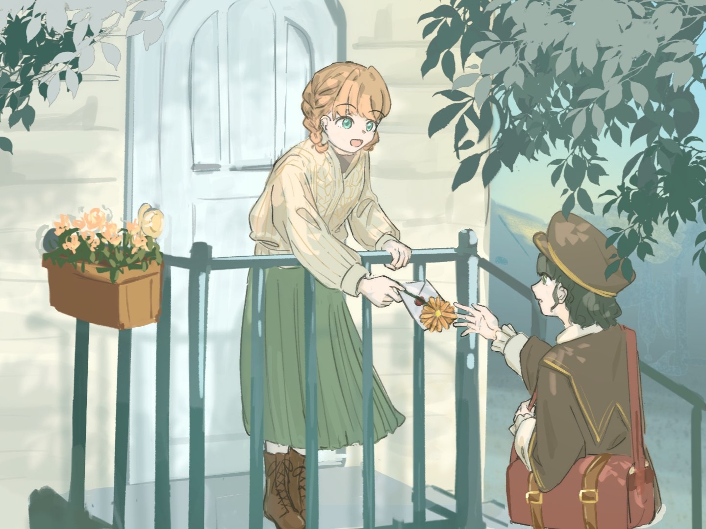2girls :d alternate_universe aqua_eyes bag boots braid brown_bag brown_boots brown_hat brown_jacket cardigan cerise_bouquet commentary daisy_(flower) envelope flower green_skirt haikei_mirai_no_kimi_e_(love_live!) hat hinoshita_kaho holding holding_envelope holding_flower jacket kasaki_(zdp8dmaj7kb5tzv) lace-up_boots link!_like!_love_live! long_sleeves looking_at_another love_live! messenger_bag momose_ginko multiple_girls open_mouth orange_flower outdoors pleated_skirt shoulder_bag side_braids skirt smile standing untranslatable_commentary virtual_youtuber yellow_cardigan