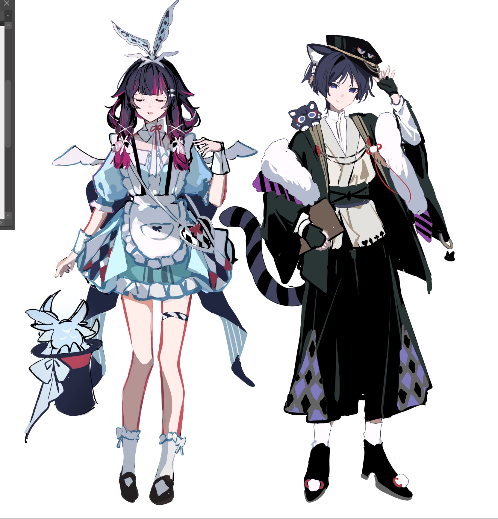 1boy 1girl alternate_costume alternate_hairstyle animal animal_ear_fluff animal_ear_hairband animal_ears animal_on_shoulder animalization apron arm_at_side art_program_in_frame bag black_gloves black_hair black_hakama black_haori black_hat black_jacket black_pants black_sash black_shoes black_sleeves blue_dress blue_sleeves blunt_bangs blunt_ends blunt_tresses bow bow_legwear bowtie c_ixxp cat cat_boy cat_ears cat_on_shoulder cat_tail closed_eyes closed_mouth clothing_request collarbone columbina_(genshin_impact) commentary detached_collar dress eye_mask eyeliner eyes_visible_through_eyewear facing_viewer fake_animal_ears feathers fingerless_gloves frilled_apron frilled_dress frilled_socks frills full_body fur_shawl genshin_impact gloves hair_bow hair_ribbon hair_rings hairband hakama hakama_pants hand_up handbag haori haori_himo hat heart-shaped_bag highres in_hat jacket japanese_clothes juliet_sleeves layered_sleeves long_sleeves luonnotar_(genshin_impact) makeup mandarin_collar mary_janes mask multicolored_hair obi open_clothes open_jacket open_mouth pants peaked_cap person_and_animalization pink_hair pom_pom_footwear puffy_sleeves purple_eyes rabbit_ears red_eyeliner ribbon sash scaramouche_(cat)_(genshin_impact) scaramouche_(genshin_impact) shawl shirt shoes short_dress single_hair_intake sketch smile socks standing streaked_hair striped_tail tail thigh_strap top_hat tress_ribbon tsurime undershirt unfinished untranslatable_commentary uwagi waist_apron white_apron white_background white_bag white_bow white_bowtie white_hairband white_mask white_ribbon white_shawl white_shirt white_sleeves white_socks wispy_bangs wrist_cuffs yellow_feathers
