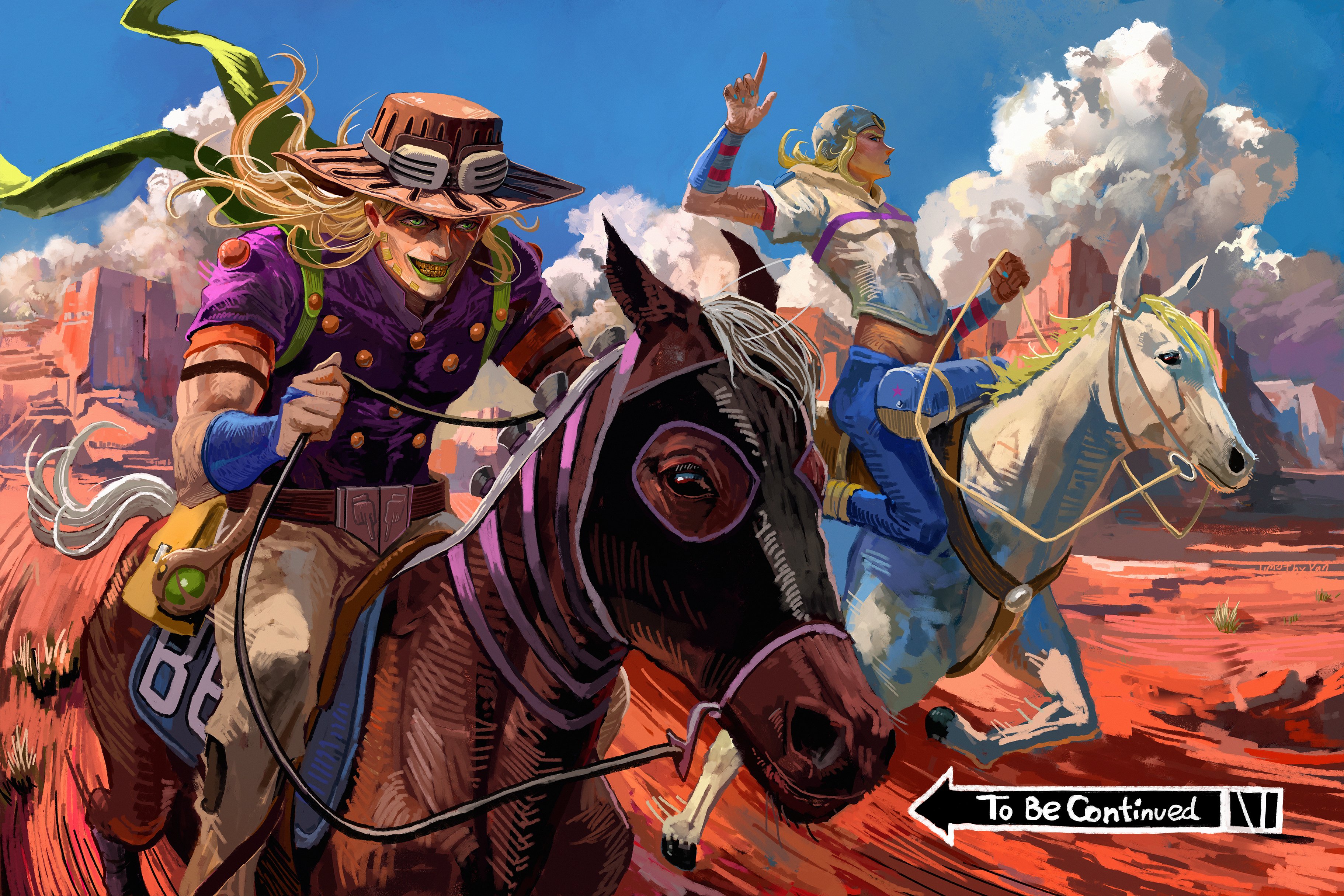 2boys absurdres arm_up arm_warmers armband belt belt_buckle black_armband black_mask blonde_hair blue_eyes blue_lips blue_nails blue_pants blue_sky brown_belt brown_hat buckle cape cloud commentary cowboy_hat desert english_commentary goggles goggles_on_headwear gold_teeth green_cape green_eyes green_lips grey_pants gyro_zeppeli hat highres holding holding_reins holster hood hoodie horse horseback_riding horseshoe_hat_ornament horseshoe_ornament johnny_joestar jojo_no_kimyou_na_bouken long_hair looking_at_viewer medium_hair multiple_boys orange_sleeves pants pointing pointing_up purple_shirt purple_sleeves red_sleeves reins riding saddle saddlebags shirt sky slow_dancer_(jojo) star_(symbol) star_print steel_ball_(jojo) steel_ball_run to_be_continued two-tone_sleeves valkyrie_(jojo) white_hat white_hoodie white_sleeves yanmanxplore