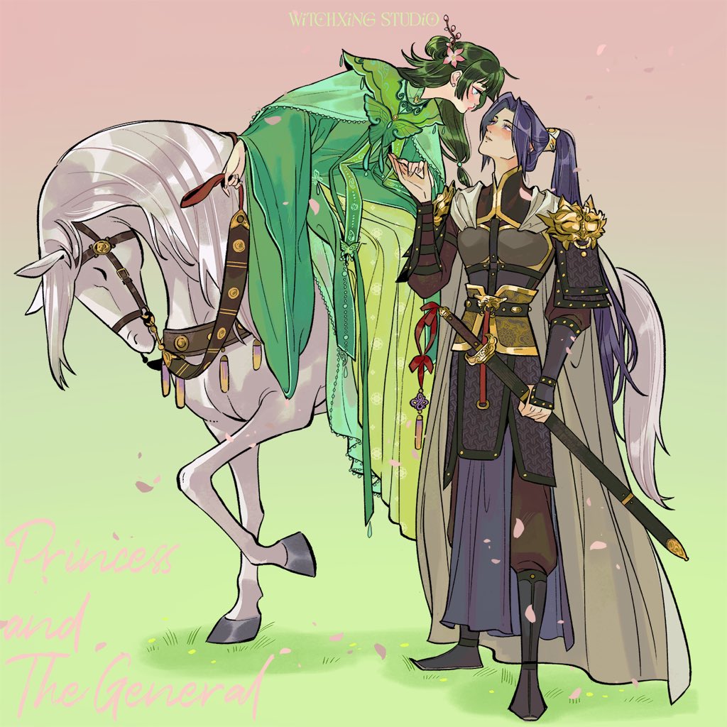 1boy 1girl aqua_eyes armor artist_name blunt_bangs blush butterfly_ornament cape chinese_armor chinese_commentary chinese_hairpin falling_petals flower full_body gold_armor gradient_background green_eyes green_hair hair_flower hair_ornament half_updo hetero holding holding_hands holding_sword holding_weapon horseback_riding jinshi_(kusuriya_no_hitorigoto) kiddo_hah kusuriya_no_hitorigoto la_belle_dame_sans_merci leaning_forward long_hair looking_at_another maomao_(kusuriya_no_hitorigoto) parted_bangs parted_lips petals pink_flower pink_petals ponytail purple_eyes purple_hair red_lips riding shoulder_armor standing sword weapon white_cape white_horse wide_sleeves