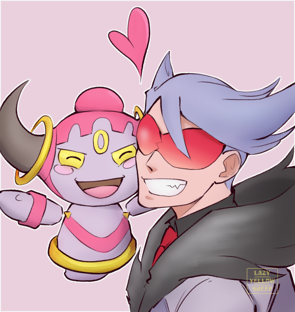 1boy artist_logo blush_stickers commentary english_commentary gen_6_pokemon grey_hair heart hoopa hoopa_(confined) horns lazyyellowsheep lear_(pokemon) legendary_pokemon logo male_focus mythical_pokemon nintendo outline pink_background pokemon pokemon_(creature) pokemon_masters_ex red-tinted_eyewear smile teeth tinted_eyewear upper_body white_outline