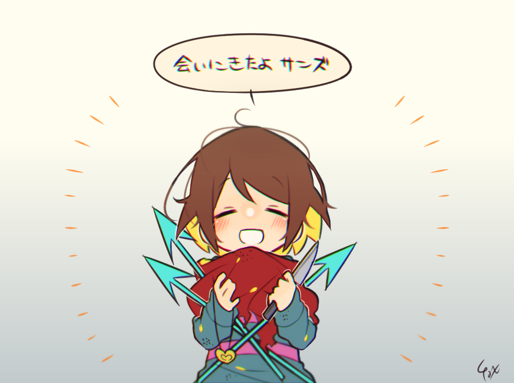 1other arrow_(projectile) blue_sweater blush brown_hair closed_eyes commentary_request facing_viewer frisk_(undertale) hands_up holding holding_knife kitsune_no_ko knife long_sleeves messy_hair multicolored_hair open_mouth red_scarf scarf short_hair smile solo speech_bubble sweater translation_request two-tone_hair undertale upper_body utdr_(toby_fox)