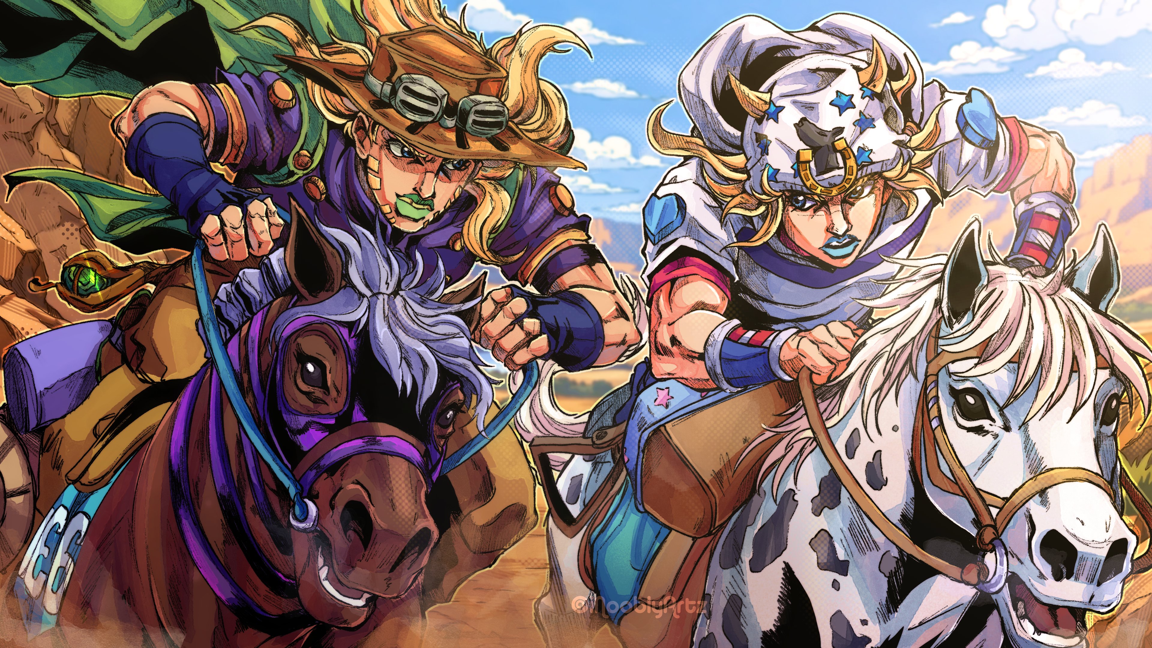 2boys absurdres arm_warmers armband belt belt_buckle blonde_hair blue_eyes blue_lips blue_nails blue_sky brown_belt brown_hat brown_pants buckle cape cloud commentary cowboy_hat desert english_commentary goggles goggles_on_headwear gold_teeth green_cape green_lips gyro_zeppeli hair_horns hat highres holding holding_reins holster hood hoodie horse horseback_riding horseshoe_hat_ornament horseshoe_ornament inooblyartz johnny_joestar jojo_no_kimyou_na_bouken long_hair looking_at_viewer medium_hair multiple_boys orange_sleeves pants purple_armband purple_mask purple_shirt purple_sleeves red_sleeves reins riding saddle saddlebags shirt sky slow_dancer_(jojo) star_(symbol) star_print steel_ball_(jojo) steel_ball_run to_be_continued two-tone_sleeves valkyrie_(jojo) white_hat white_hoodie white_sleeves