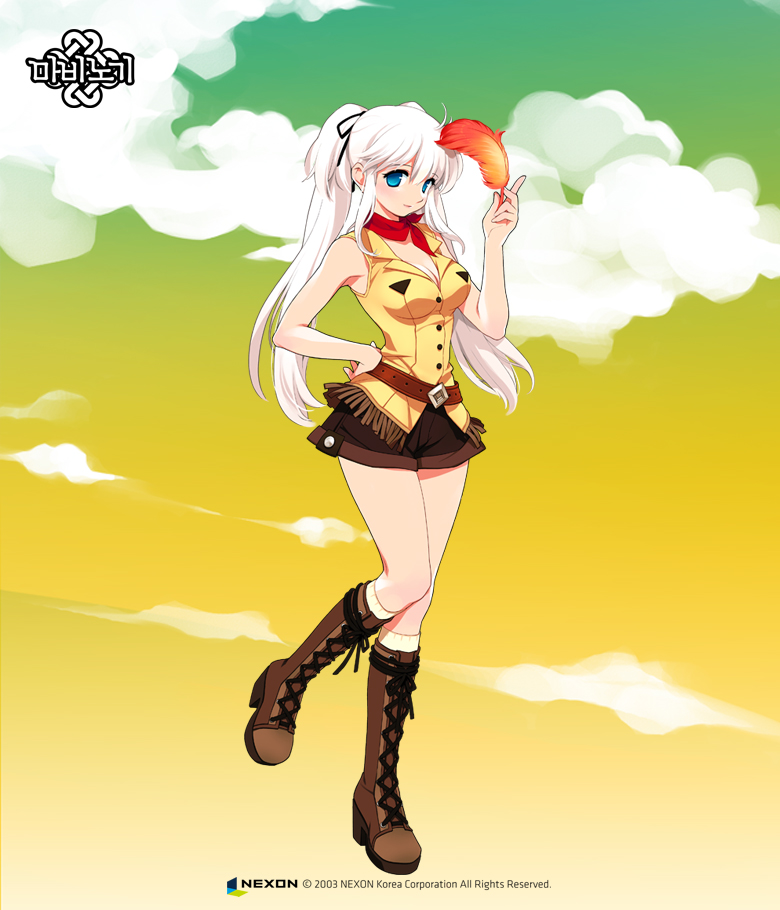 aqua_eyes armpit_peek bare_shoulders belt boots feathers full_body handkerchief leather leather_boots mabinogi nao_(mabinogi) nexon official_art shirt shorts sleeveless sleeveless_shirt thighs twintails white_hair