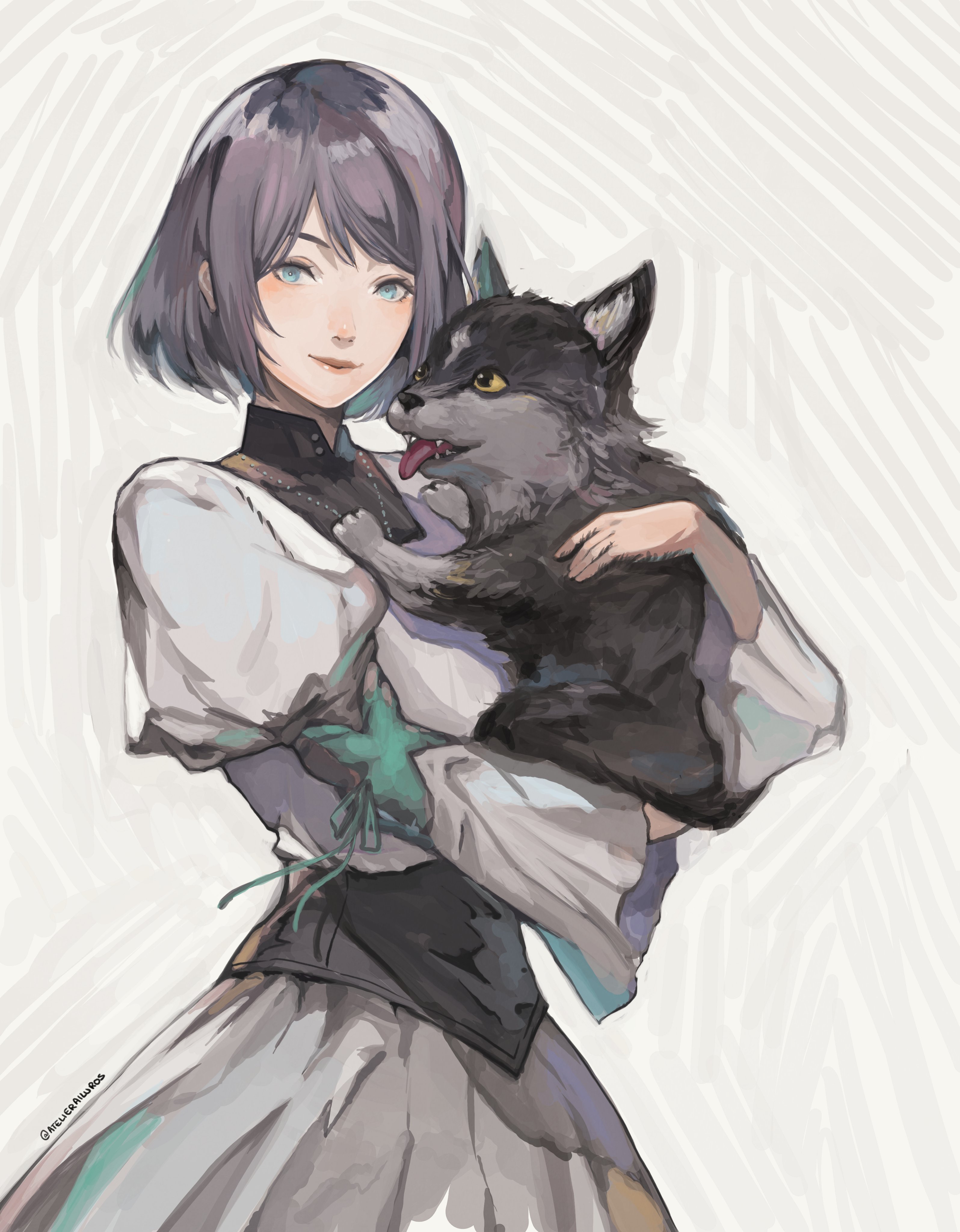 1girl absurdres animal baby_animal blue_eyes bob_cut catthy_trinh closed_mouth collared_dress commentary cow dog dress english_commentary final_fantasy final_fantasy_xvi grey_background grey_hair highres holding holding_animal holding_dog jill_warrick juliet_sleeves light_blush light_smile long_sleeves looking_at_viewer puffy_sleeves puppy short_hair simple_background tongue tongue_out torgal_(ff16) twitter_username white_dress wolf yellow_eyes