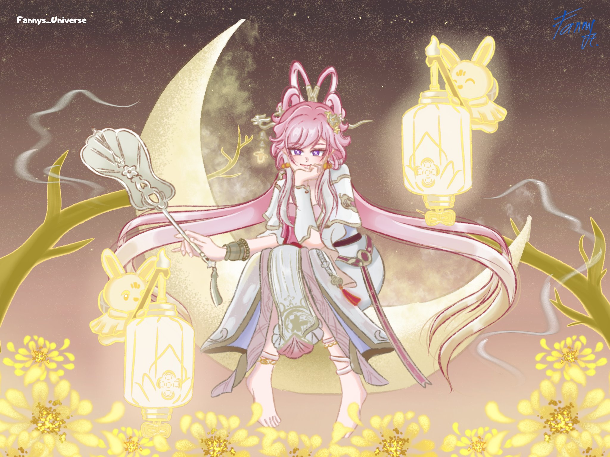 1girl artist_name barefoot blonde_hair chinese_clothes commentary crescent_moon diamond-shaped_pupils diamond_(shape) dress elysia_(hi_love_elf)_(honkai_impact) elysia_(honkai_impact) elysia_(lunar_grace)_(honkai_impact) english_commentary fannys_universe feet feixianji_(hairstyle) flower hair_rings hand_fan highres holding holding_fan honkai_(series) honkai_impact_3rd lantern long_hair moon multiple_tails official_alternate_costume on_crescent on_moon paper_lantern pink_hair purple_eyes rabbit sitting sky_lantern smile solo symbol-shaped_pupils tail toes very_long_hair white_dress white_hair yellow_flower