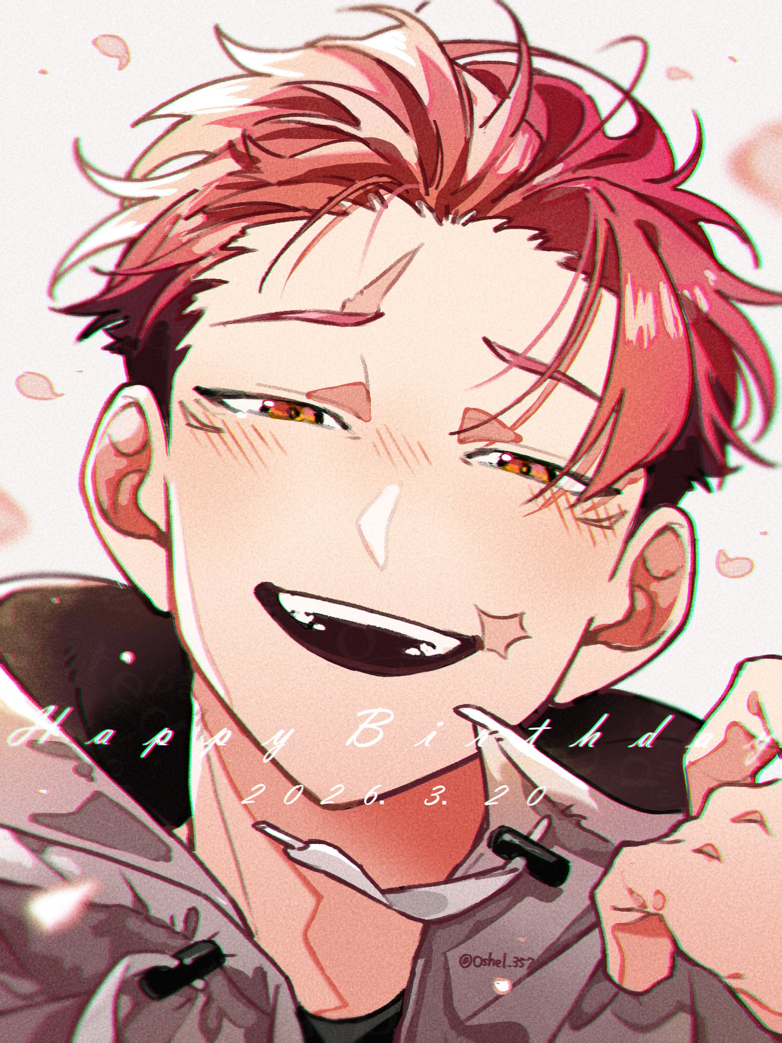1boy black_hair black_shirt blush commentary_request dated drawstring english_text grey_jacket happy_birthday highres itadori_yuji jacket jujutsu_kaisen male_focus multicolored_hair open_mouth oshel_357 petals pink_eyes pink_hair portrait scar scar_on_face shirt smile solo teeth two-tone_hair upper_teeth_only white_background
