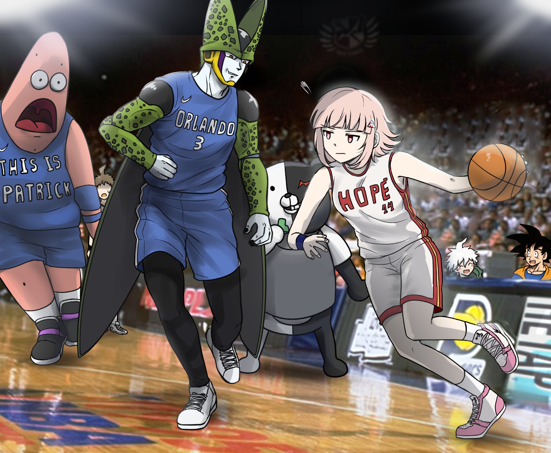 1girl 5boys ball basketball basketball_(object) basketball_uniform black_hair breasts buruma cell_(dragon_ball) d: danganronpa_(series) danganronpa_2:_goodbye_despair dragon_ball dragonball_z gym_shirt gym_uniform highres hinata_hajime indoors kmnm_1403 monokuma multiple_boys nanami_chiaki open_mouth patrick_star perfect_cell playing_sports running shirt shoes short_hair shorts sneakers son_goku spongebob_squarepants_(series) sportswear stadium standing white_shirt