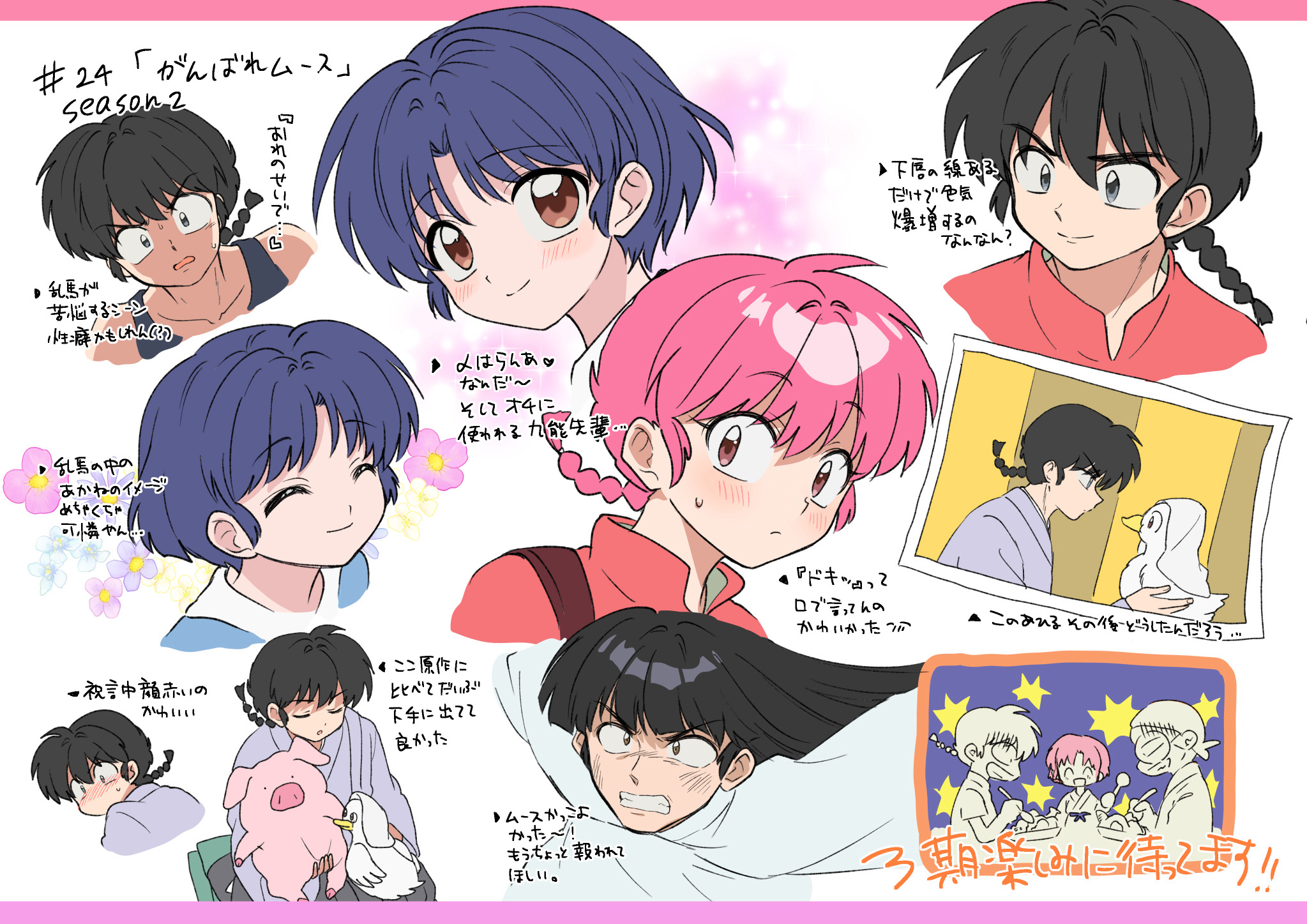 2girls 3boys ^_^ bird black_hair blue_hair braid brown_eyes clenched_teeth closed_eyes closed_mouth commentary_request duck flower grey_eyes highres long_hair mio_(melchi) mousse_(ranma_1/2) multiple_boys multiple_girls pink_flower purple_flower ranma-chan ranma_1/2 saotome_genma saotome_ranma short_hair single_braid stuffed_animal stuffed_toy teeth tendou_akane translation_request v-shaped_eyebrows white_flower