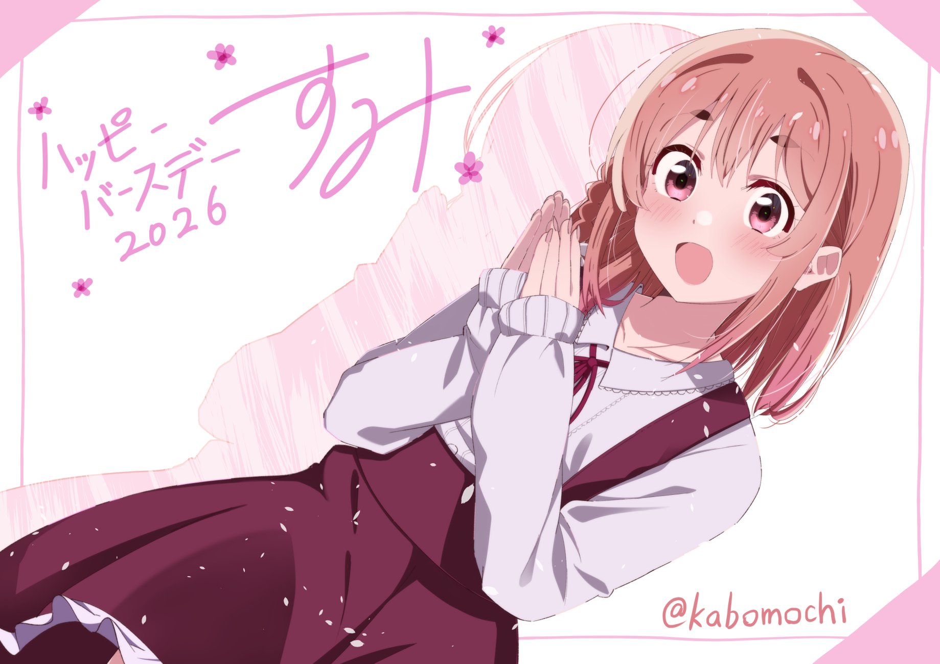 1girl 2026 birthday cherry_blossoms collarbone dot_nose feet_out_of_frame female_focus hair_between_eyes japanese_text kabomochi kanojo_okarishimasu long_hair long_sleeves looking_at_viewer open_mouth pink_hair sakurasawa_sumi shadow standing translation_request twitter_username