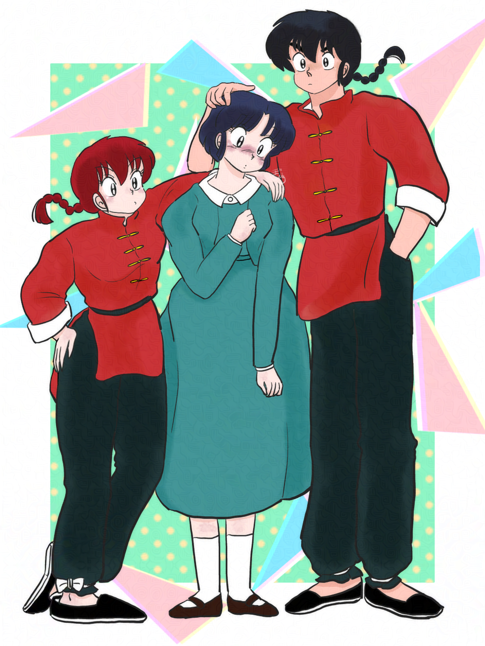 1boy 2girls arm_around_shoulder bisexual_female black_eyes black_hair black_pants black_shoes blue_dress blue_hair blush bonjirygushi braid chinese_clothes commentary_request dress hand_on_another's_head highres multiple_girls pants ranma-chan ranma_1/2 red_hair saotome_ranma shoes short_hair single_braid tendou_akane v-shaped_eyebrows