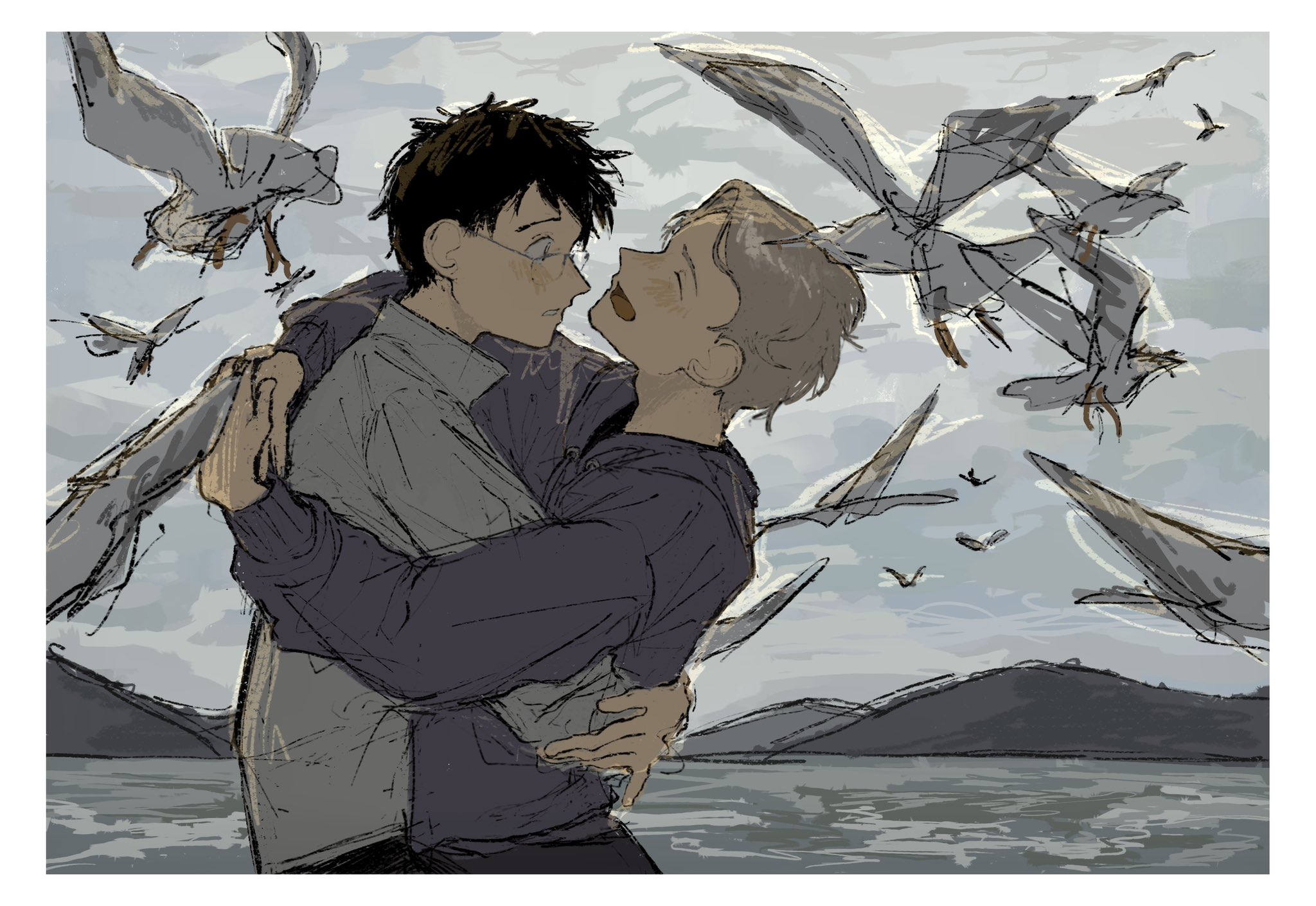 2boys beach bird black_hair blush closed_eyes commentary_request garrrrrz glasses grey_hair highres hug jacket katsuki_yuuri laughing looking_at_another male_focus mountain multiple_boys seagull short_hair sky viktor_nikiforov yaoi yuri!!!_on_ice