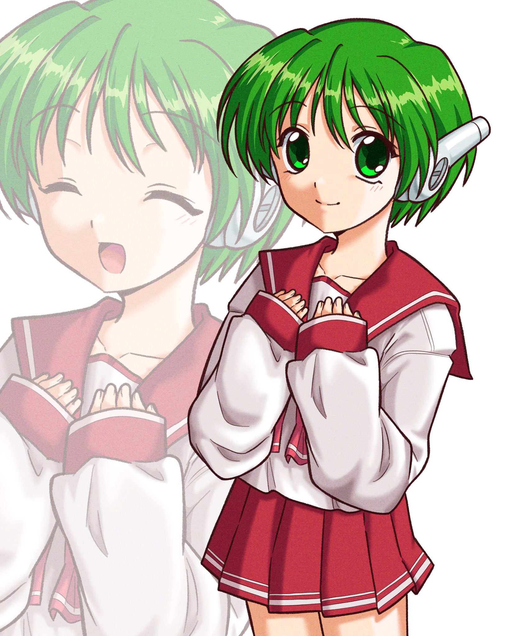 1girl closed_eyes closed_mouth collarbone feet_out_of_frame female_focus green_eyes grey_hair hair_between_eyes kamuba7772008 legs long_sleeves looking_at_viewer multi_(to_heart) open_mouth red_sailor_collar red_skirt robot_ears robot_girl sailor_collar school_uniform shirt short_hair simple_background skirt smile solo standing to_heart to_heart_(series) white_background