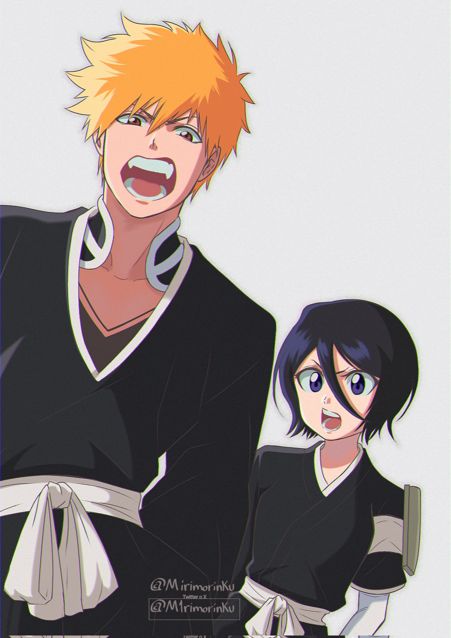 1boy 1girl badge black_hair bleach brown_eyes chest_tattoo commentary corrupted_twitter_file fukutaichou_badge hair_between_eyes height_difference highres japanese_clothes kuchiki_rukia kurosaki_ichigo m1rimorinku open_mouth orange_hair purple_eyes shihakusho short_hair tattoo twitter_username watermark