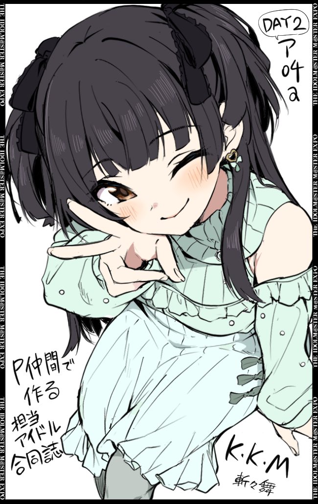 1girl ;) aqua_shirt aqua_skirt artist_name bare_shoulders black_bow black_hair blunt_bangs blush bow brown_eyes closed_mouth clothing_cutout commentary_request earrings feet_out_of_frame foreshortening frilled_bow frilled_shirt frilled_sleeves frills from_above hair_bow hand_up happy heart heart_earrings idolmaster idolmaster_shiny_colors jewelry kirikirimai_(kkm) long_hair long_sleeves looking_at_viewer mayuzumi_fuyuko one_eye_closed pleated_skirt shirt shoulder_cutout sidelocks simple_background sitting sketch skirt skirt_bow smile solo straight_hair translation_request two_side_up v white_background