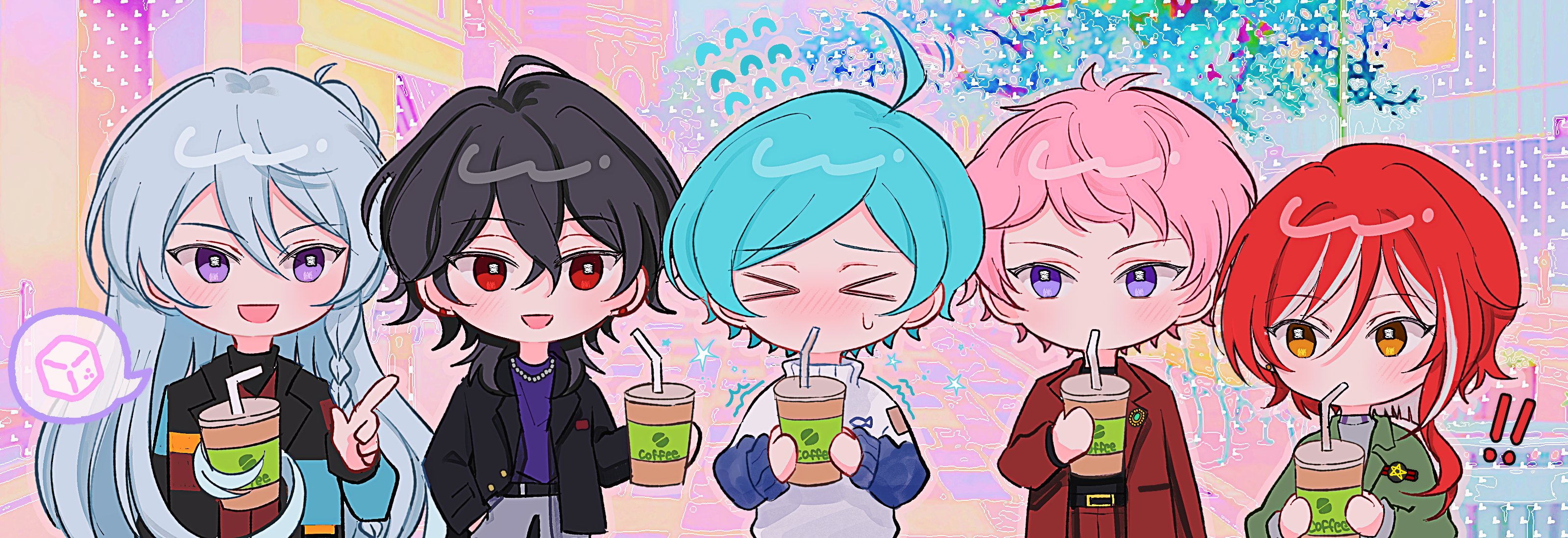 ! !! >_< 5boys :d absurdres ahoge aqua_hair asymmetrical_hair belt belt_buckle bitter black_belt black_hair black_jacket black_shirt blue_sleeves blush braid buckle chibi chibi_only coat coffee colorful_background commentary_request crossed_bangs cup drinking drinking_straw earrings ensemble_stars! flying_sweatdrops green_jacket grey_pants grey_shirt hair_between_eyes hair_bun hibiki_wataru highres holding holding_cup holding_with_hair itsuki_shu jacket jewelry kk2z korean_commentary layered_sleeves long_hair looking_at_another male_focus medium_hair multicolored_hair multicolored_jacket multiple_boys necklace open_mouth orange_eyes outdoors pants pink_hair prehensile_hair purple_eyes purple_shirt raised_inner_eyebrows red_coat red_eyes red_hair red_pants sakasaki_natsume sakuma_rei_(ensemble_stars!) shinkai_kanata shirt short_bangs side_braid single_side_bun small_sweatdrop smile speech_bubble spoken_food streaked_hair stud_earrings sugar_cube sweater the_oddballs_(ensemble_stars!) trembling white_streaks white_sweater