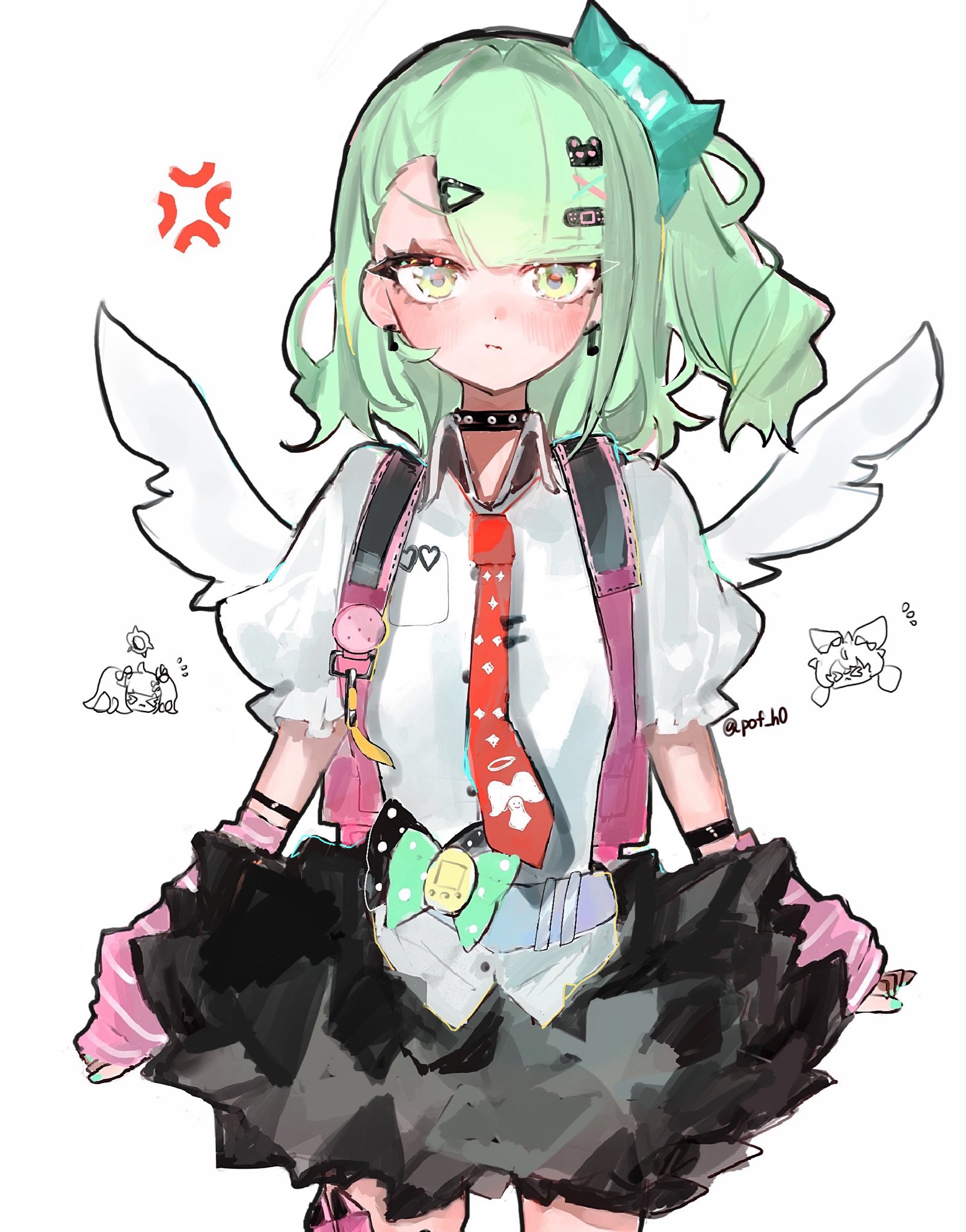 3girls anger_vein aria_(zenless_zone_zero) arm_warmers bag bandaid bandaid_hair_ornament black_skirt blush closed_mouth collar commentary cowboy_shot earrings green_eyes green_hair hair_ornament heart heart_hair_ornament highres jewelry looking_at_viewer multiple_girls multiple_hair_clips musical_note_earrings nangong_yu necktie pink_arm_warmers pink_bag pof_h0 ponytail red_necktie shirt simple_background skirt striped_arm_warmers sunna_(zenless_zone_zero) twitter_username white_background white_shirt white_wings winged_bag wings zenless_zone_zero