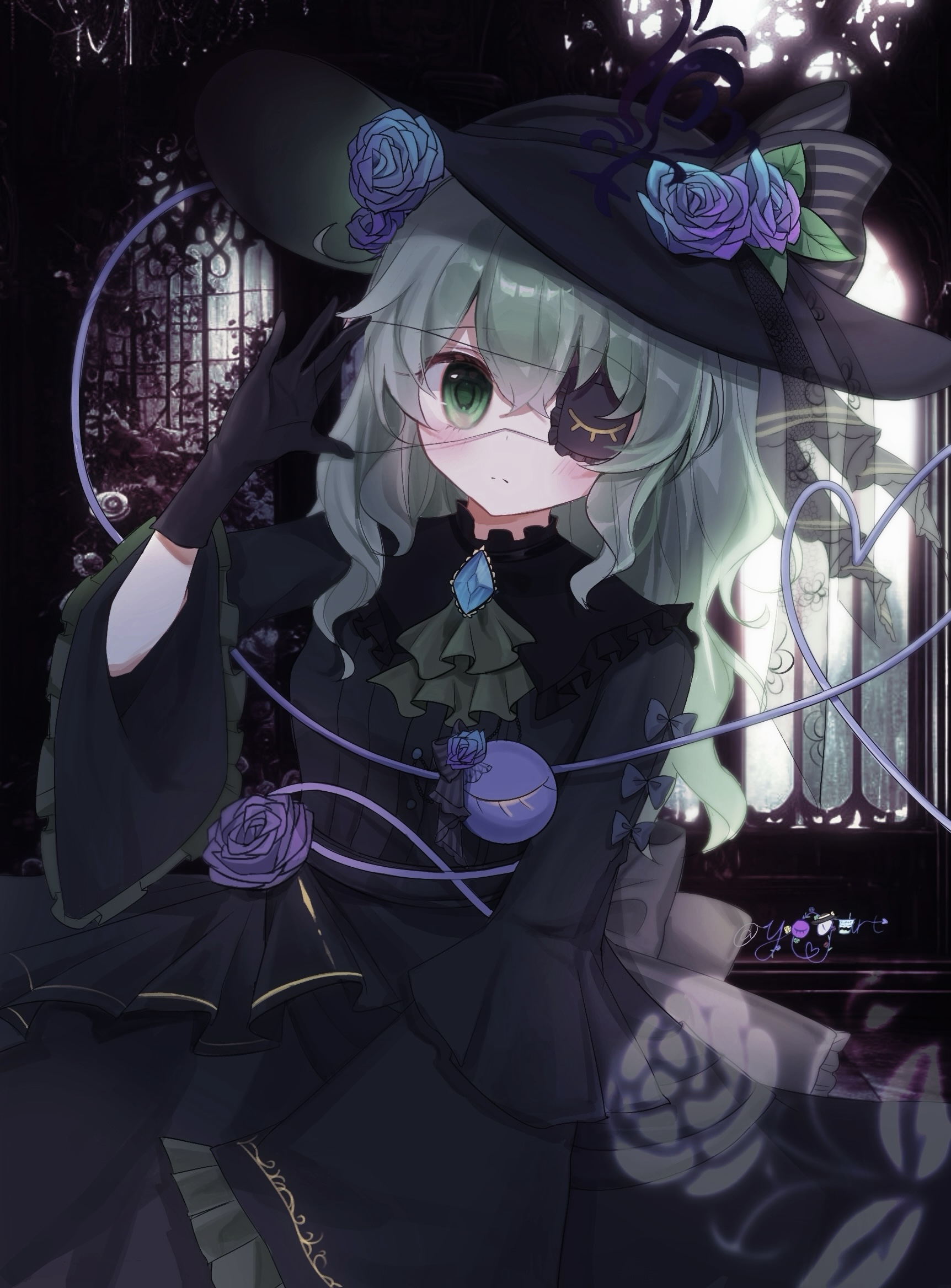 1girl alternate_costume alternate_hair_length alternate_hairstyle ascot belt black_belt black_dress black_gloves black_hat black_ribbon blue_flower blue_gem blue_rose blush buttons castle closed_mouth commentary_request cowboy_shot crossed_bangs dress eyepatch floral_print flower frills gem gloves green_ascot green_eyes green_hair green_hat hand_up hat hat_flower hat_ornament hat_ribbon heart heart_of_string highres indoors jewelry komeiji_koishi leaf_hat_ornament leaf_print long_hair long_sleeves looking_at_viewer pendant puritan_collar purple_flower purple_rose ribbon rose rose_print sidelocks solo standing striped_ribbon third_eye touhou two-sided_fabric two-sided_headwear wavy_hair wide_sleeves window yogurtkoii