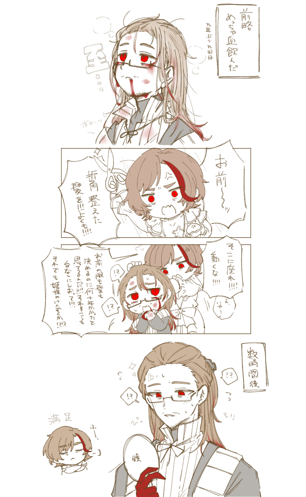 !? 1boy 1girl 4koma =_= absurdres alternate_costume alternate_hair_length alternate_hairstyle anger_vein angry annoyed arms_up bags_under_eyes beard_stubble black-framed_eyewear black-framed_glasses black_coat black_hair black_suit black_undershirt bleeding bleeding_from_mouth blood blood_from_mouth blood_in_hair blood_on_cheek blood_on_clothes blood_on_face blood_on_hands blood_stain blush bow breath brown_hair capelet chibi chibi_inset clenched_hand closed_eyes closed_mouth coat collared_shirt colored_extremities colored_skin comb comic crossed_arms dirty dress e.g.o_(project_moon) expressionless facial_hair fang fixing_hair flying_sweatdrops forehead formal_clothes frilled_dress frilled_sleeves frills from_side glasses gregor_(project_moon) hair_between_eyes hair_slicked_back half_updo hand_mirror hand_up hands_up high_collar highres holding holding_another's_hair holding_mirror holding_scissors holding_weapon jitome la_manchaland_(identity)_(project_moon) lily26983455 limbus_company limited_palette long_dress long_hair long_sleeves looking_at_another looking_down looking_up loose_hair_strand male_focus messy_hair mirror monochrome multicolored_hair multiple_views off_shoulder official_alternate_costume open_clothes open_coat open_mouth outis_(project_moon) parted_lips pinstripe_pattern ponytail project_moon puff_of_air red_eyes red_hair red_hands red_skin ribbed_shirt ribbon sanpaku scarf scissors shirt short_hair simple_background sitting skin_fang sparkle speech_bubble spoken_interrobang spot_color squeans standing stole streaked_hair striped_clothes striped_scarf stubble suit sweat sweatdrop turtleneck turtleneck_shirt two-tone_hair undershirt very_long_hair wavy_hair weapon white_background white_scarf white_shirt white_stole