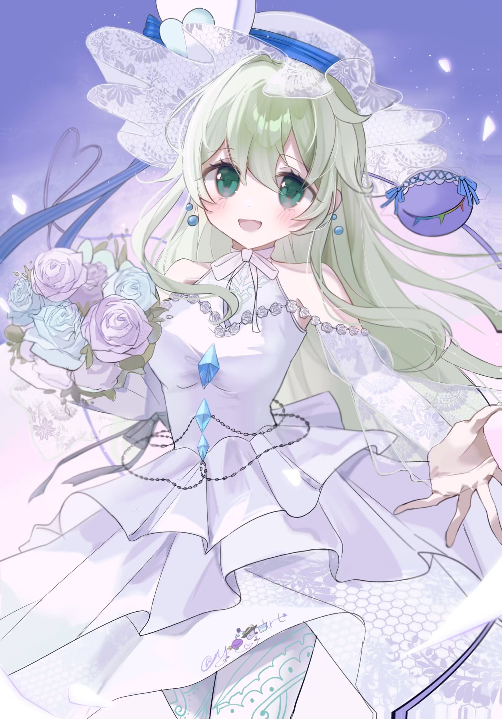 1girl alternate_costume alternate_hair_length alternate_hairstyle artist_name bare_shoulders blue_flower blue_ribbon blue_rose blush bouquet bow bowtie breasts bride buttons chain commentary_request covered_collarbone detached_sleeves diamond_button dress earrings floating_hair floral_print flower green_eyes green_hair hair_between_eyes hands_up happy hat hat_ribbon heart heart_of_string highres holding holding_bouquet jewelry komeiji_koishi long_hair long_sleeves looking_at_viewer medium_breasts open_mouth pantyhose petals pink_background pink_bow pink_bowtie purple_background purple_flower purple_rose ribbon rose see-through_clothes see-through_sleeves sidelocks sleeveless sleeveless_dress smile solo striped_ribbon third_eye touhou two-tone_background wedding_dress white_dress white_hat white_headdress white_pantyhose white_sleeves yogurtkoii