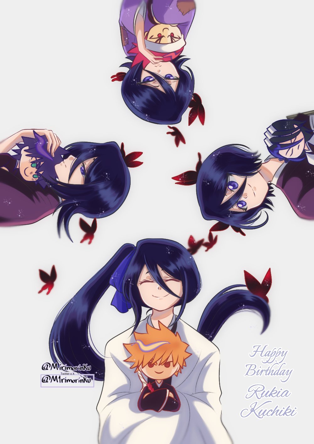 4girls abarai_renji aged_down black_hair bleach bleach:_epilogue blue_eyes bug butterfly character_doll character_name child closed_eyes commentary doll haori happy_birthday highres holding holding_doll insect japanese_clothes kimono kuchiki_byakuya kuchiki_rukia kurosaki_ichigo long_hair m1rimorinku medium_hair multiple_girls multiple_persona patchwork_clothes purple_kimono shiba_kaien short_hair side_ponytail smile spanish_commentary taichou_haori twitter_username very_long_hair watermark