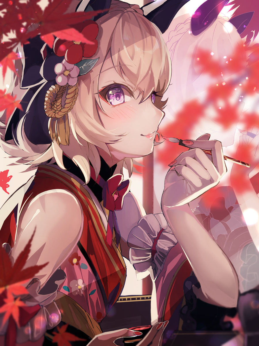 1girl animal_ears applying_lipstick applying_makeup autumn_leaves bare_shoulders blush closed_mouth commentary_request curren_chan_(cutie_pie_with_shining_eyes)_(umamusume) curren_chan_(umamusume) detached_sleeves flower grey_hair hair_flower hair_ornament highres holding holding_brush holding_makeup_brush holding_makeup_palette horse_ears horse_girl hpa_hakushaku japanese_clothes kimono leaf makeup_brush official_alternate_costume pink_lips purple_eyes red_nails short_hair sleeveless sleeveless_kimono smile solo umamusume upper_body yukata