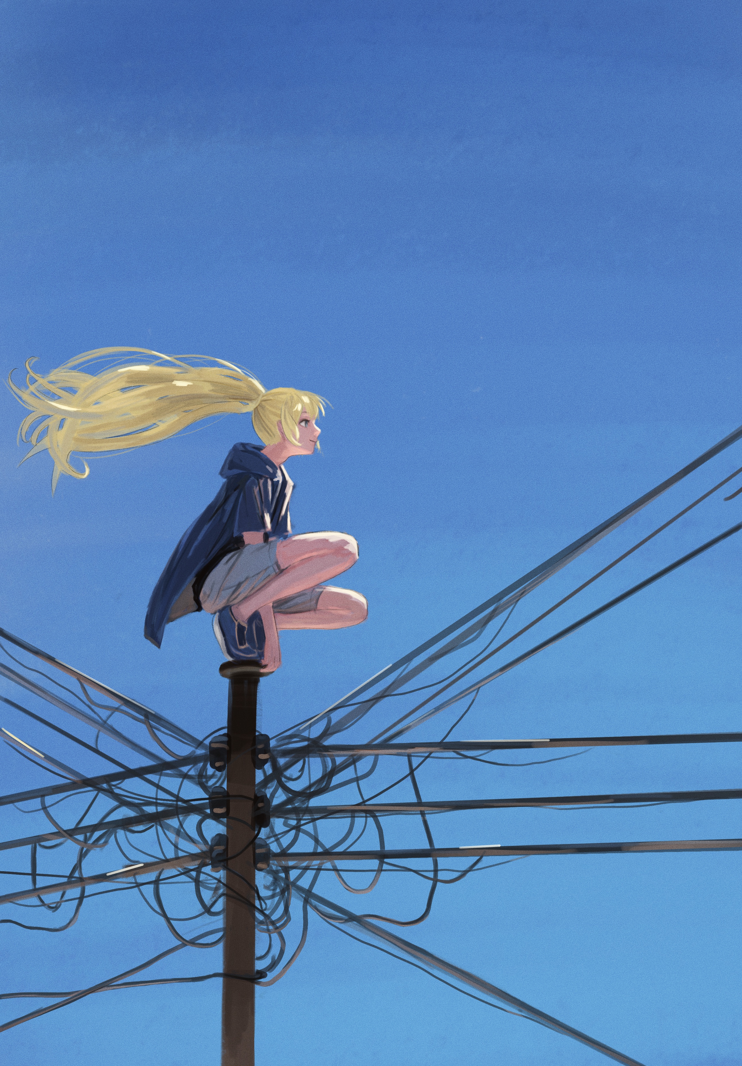 1girl absurdres between_legs black_shirt blonde_hair blue_shoes blue_sky cable diky from_behind full_body grey_shorts hand_between_legs highres hood hood_down hoodie light_smile long_hair looking_ahead on_top_of_pole original outdoors ponytail shirt shoes shorts sky sneakers solo squatting tiptoes